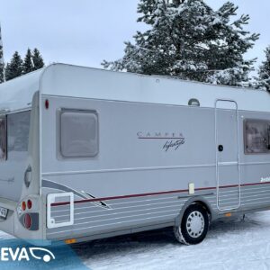 Näppäränkokoinen, kokonaispainoltaan vain 1 200- kiloinen Dethleffs nestekeskuslämmityksellä.