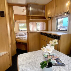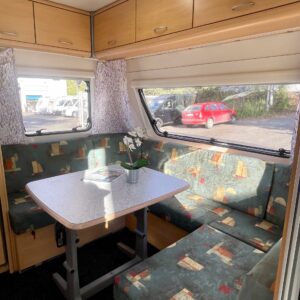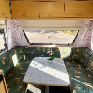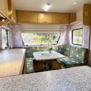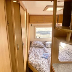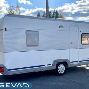 Näppäränkokoinen vaunu varustettuna tehokkaalla ja tasaisen lämmön tuottavalla Alden vesikeskuslämmityksellä. Lisäksi löytyy vielä erillisenä mukavuusvarusteena sähköinen lattianlämmitys. Avara keittötila normaalilla keittiövarustuksella. Edessä U-ryhmä mistä saa sijattua parivuoteen kahdelle henkilölle. Keskellä avara keittiötila. Takana pitkittäinen parivuode ja reilun kokoinen WC/kylpyhuonetila erillisellä suihkutilalla.