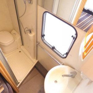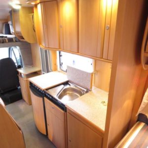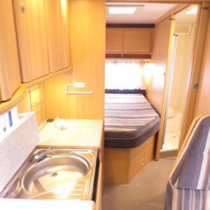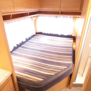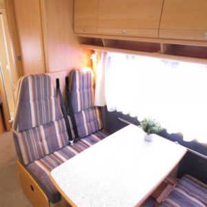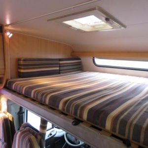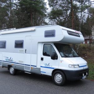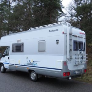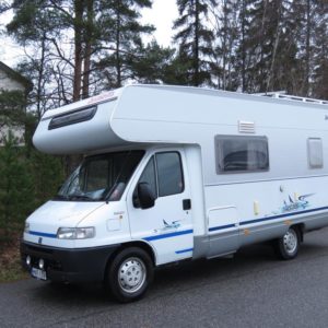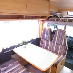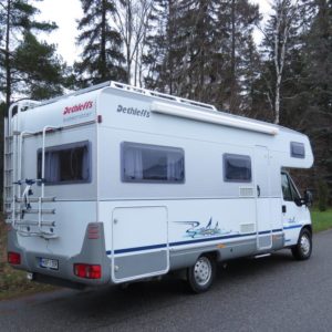 Tilava 6 henkilön alkovi Dethleffs. Keskellä normaali 4 istuttava pöytäryhmä ja pitkä keittiö . Takana parivuode pitkittäin ja vieressä wc/kylpyhuone. Edessä ohjaamon yläpuolella suuri parivuode. Toimiva kokonaisuus.