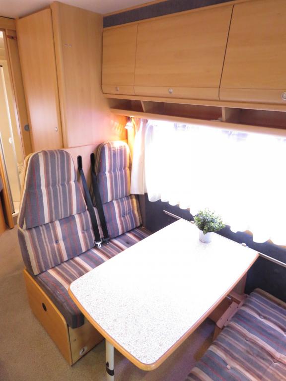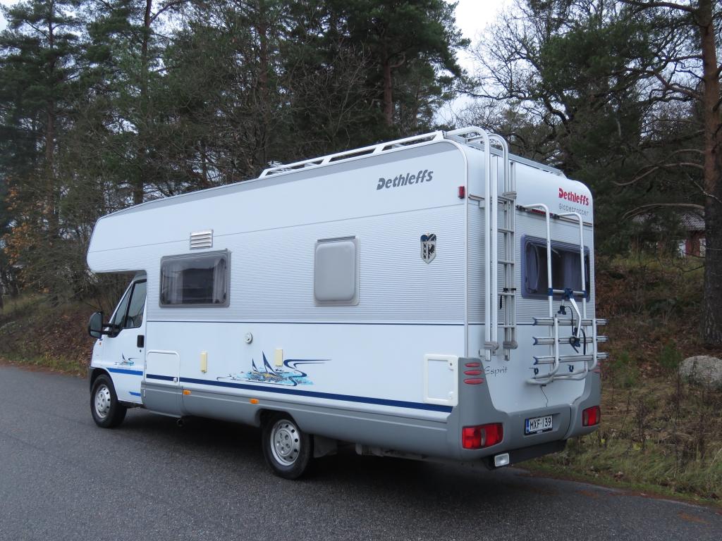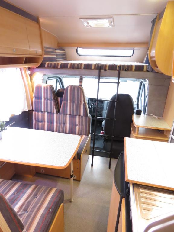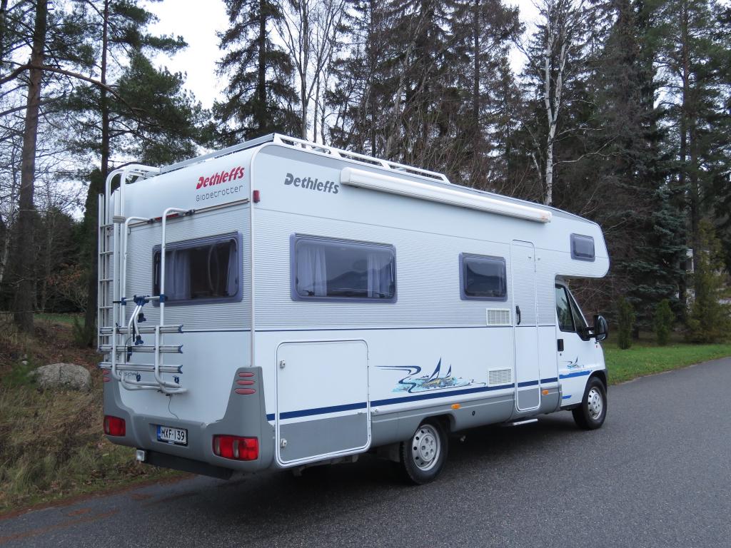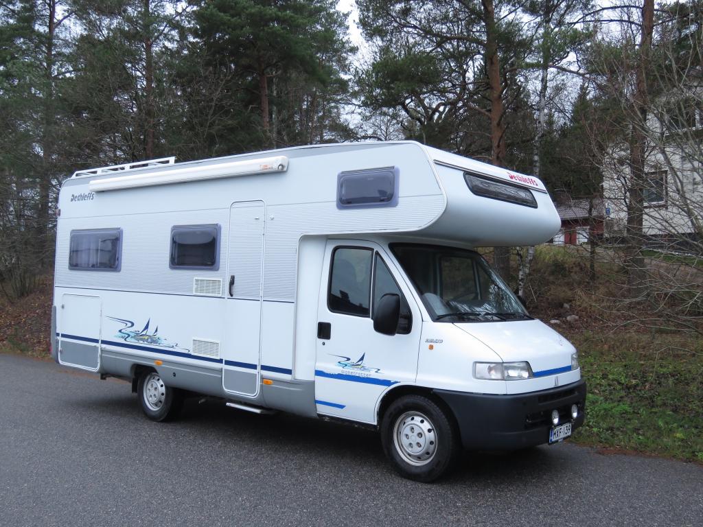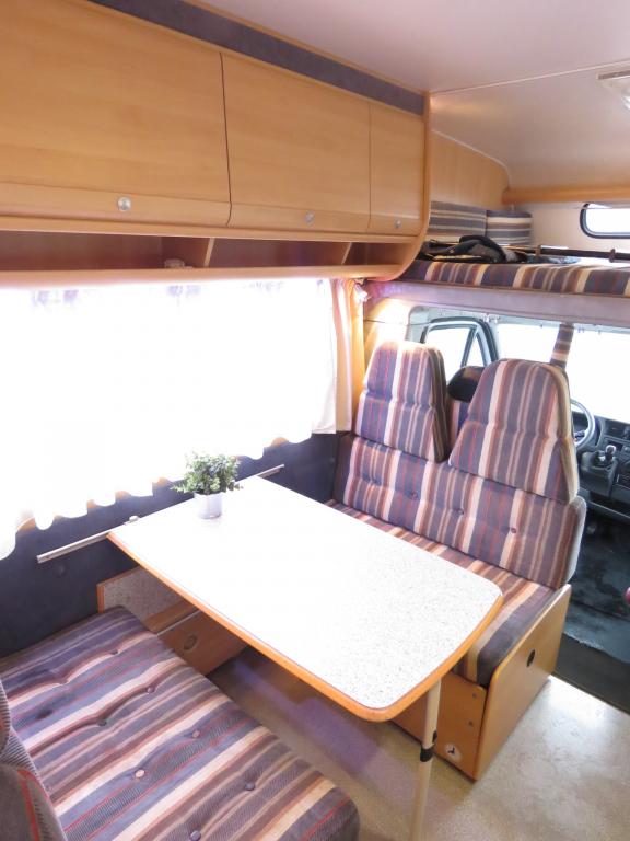 Tilava 6 henkilön alkovi Dethleffs. Keskellä normaali 4 istuttava pöytäryhmä ja pitkä keittiö . Takana parivuode pitkittäin ja vieressä wc/kylpyhuone. Edessä ohjaamon yläpuolella suuri parivuode. Toimiva kokonaisuus.