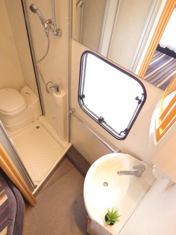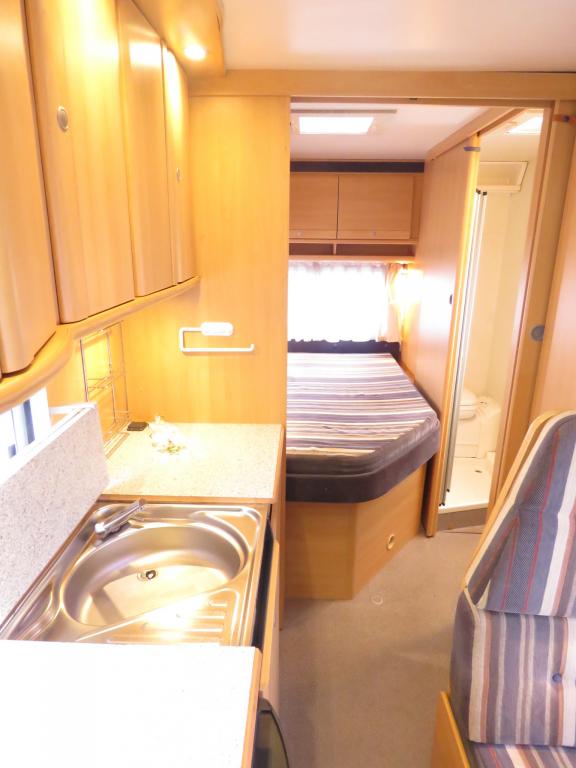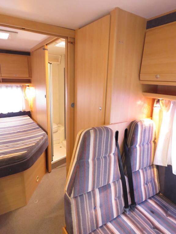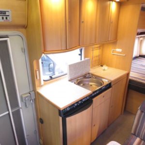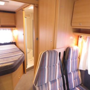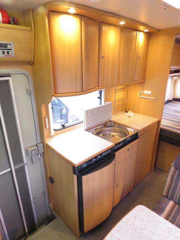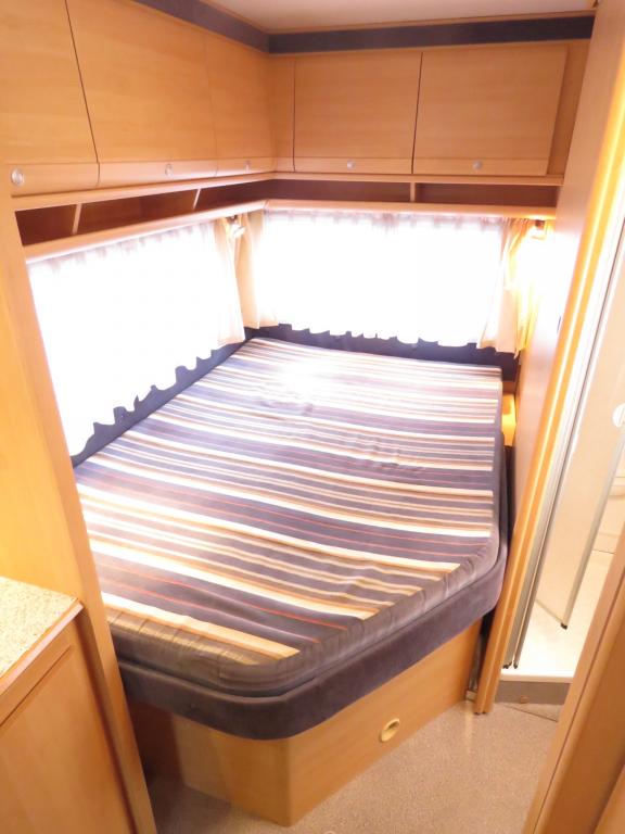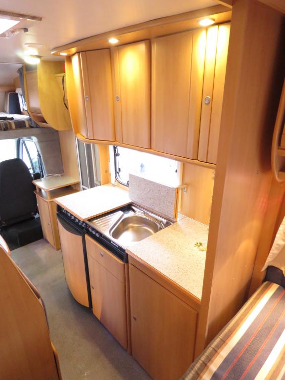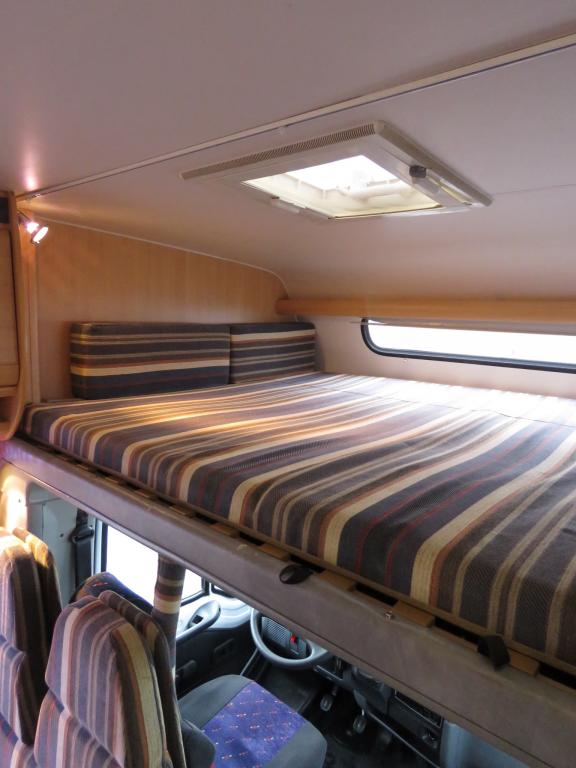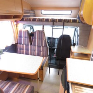 Tilava 6 henkilön alkovi Dethleffs. Keskellä normaali 4 istuttava pöytäryhmä ja pitkä keittiö . Takana parivuode pitkittäin ja vieressä wc/kylpyhuone. Edessä ohjaamon yläpuolella suuri parivuode. Toimiva kokonaisuus.