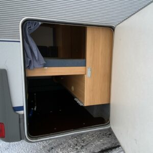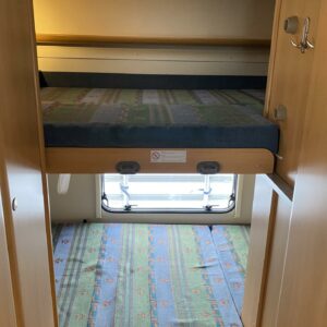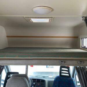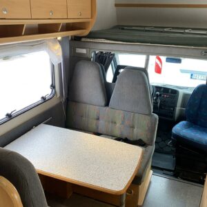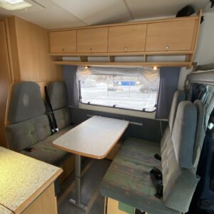 Pohjaratkaisussa takana poikittaiset kerrosvuoteet minkä alapuolella tilava takatalli. Keskellä keittiö perusvarustuksella sekä WC/kylpyhuonetilat. Edessä vastakkain istuttava pöytäryhmä mistä saa sijattua vuoteet kahdelle henkilölle ja lisäksi ohjaamon päällä tilava alkovivuode kahdelle henkilölle.
