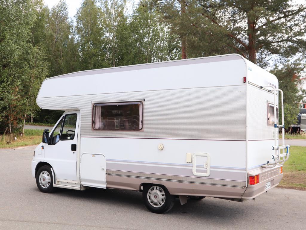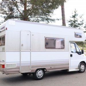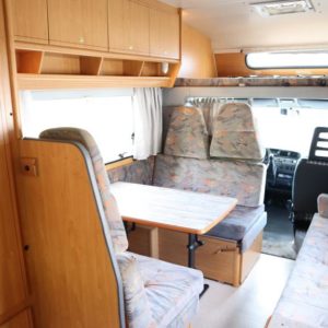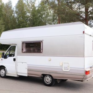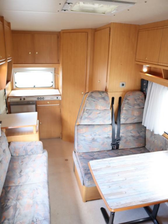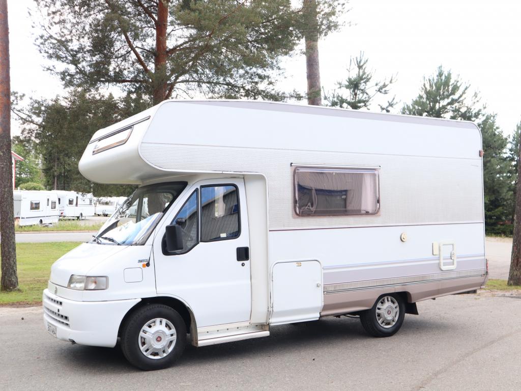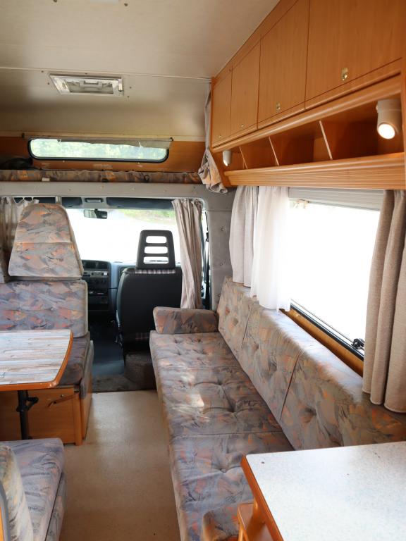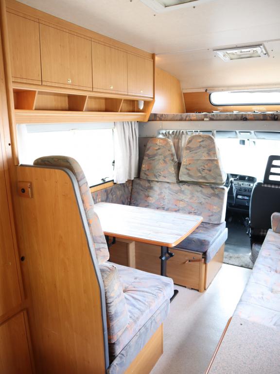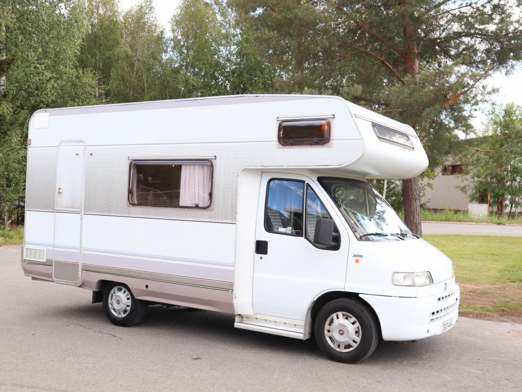 Näppäränkokoinen matka- auto kuudelle! Leveä vuode alkovissa ja viihtyisä pöytäryhmä pitkällä sivusohvalla.
