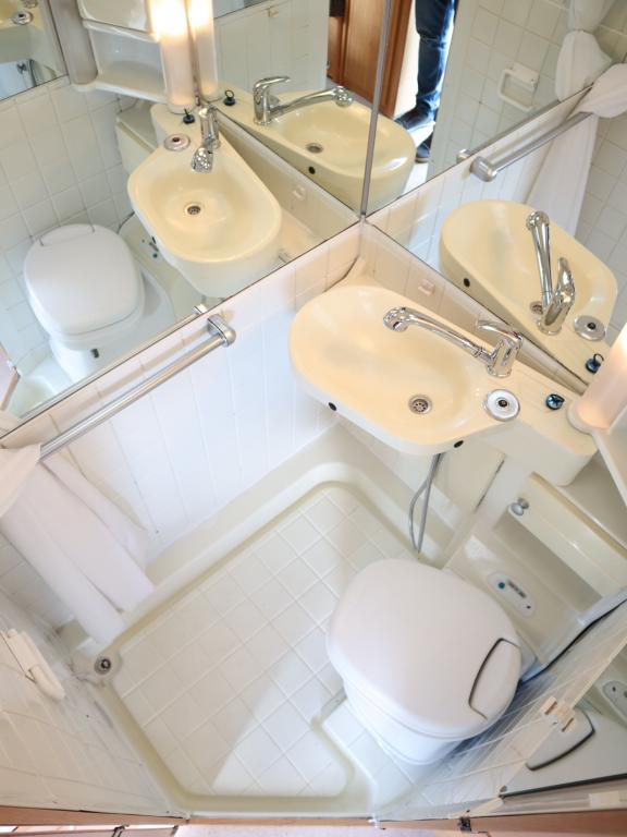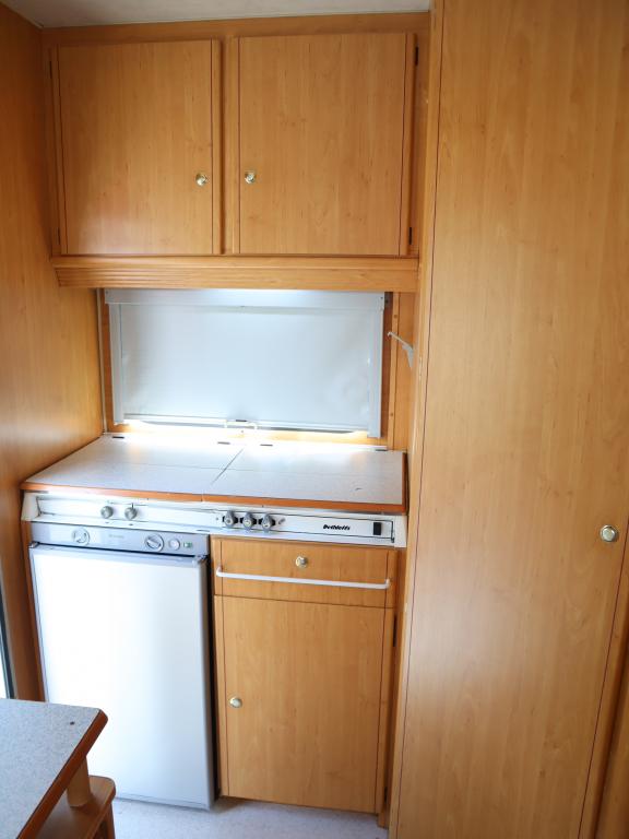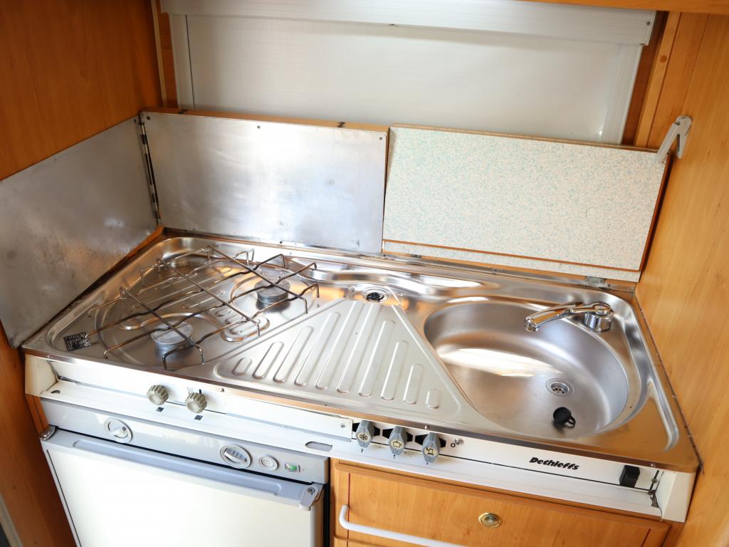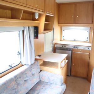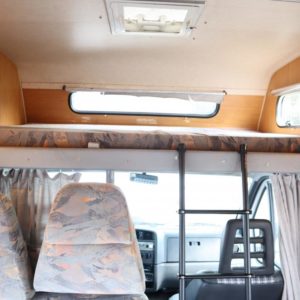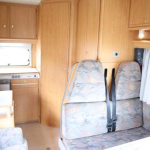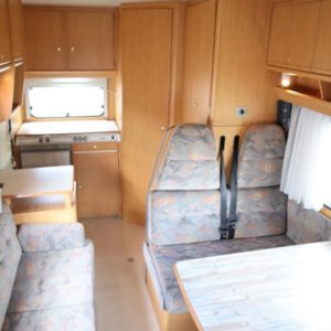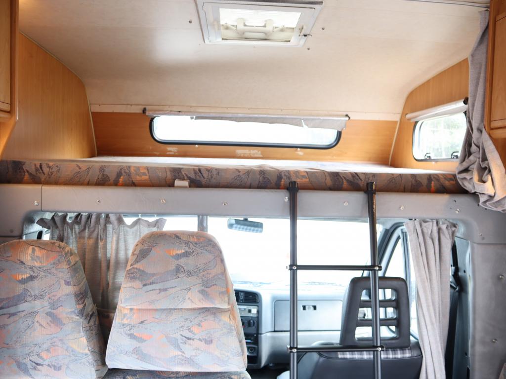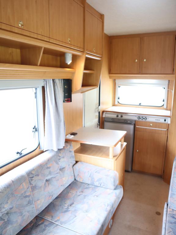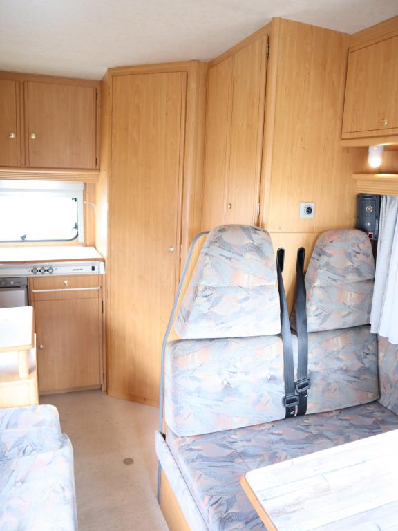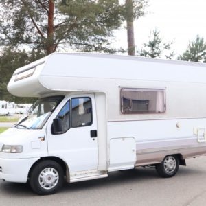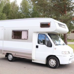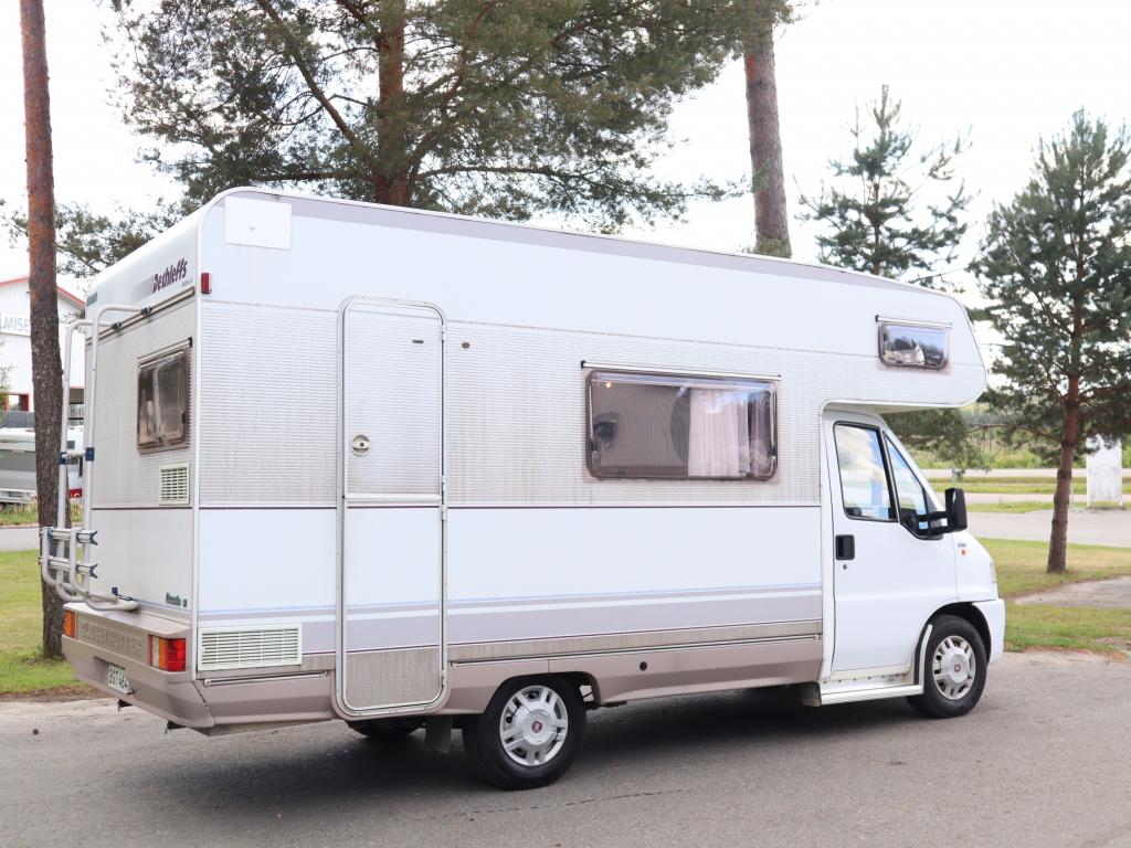 Näppäränkokoinen matka- auto kuudelle! Leveä vuode alkovissa ja viihtyisä pöytäryhmä pitkällä sivusohvalla.