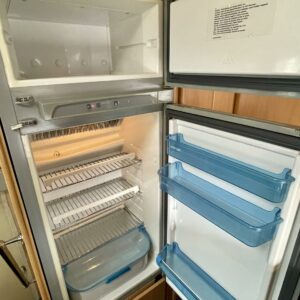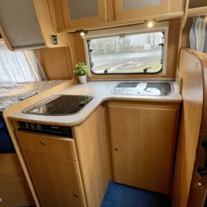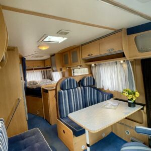Auton etuosasta löytyy superavara pöytäryhmä sivusohvalla. Keskellä autoa on nykyiaikainen L- keittiö isolla jääkaappi- pakastimella varustettuna.