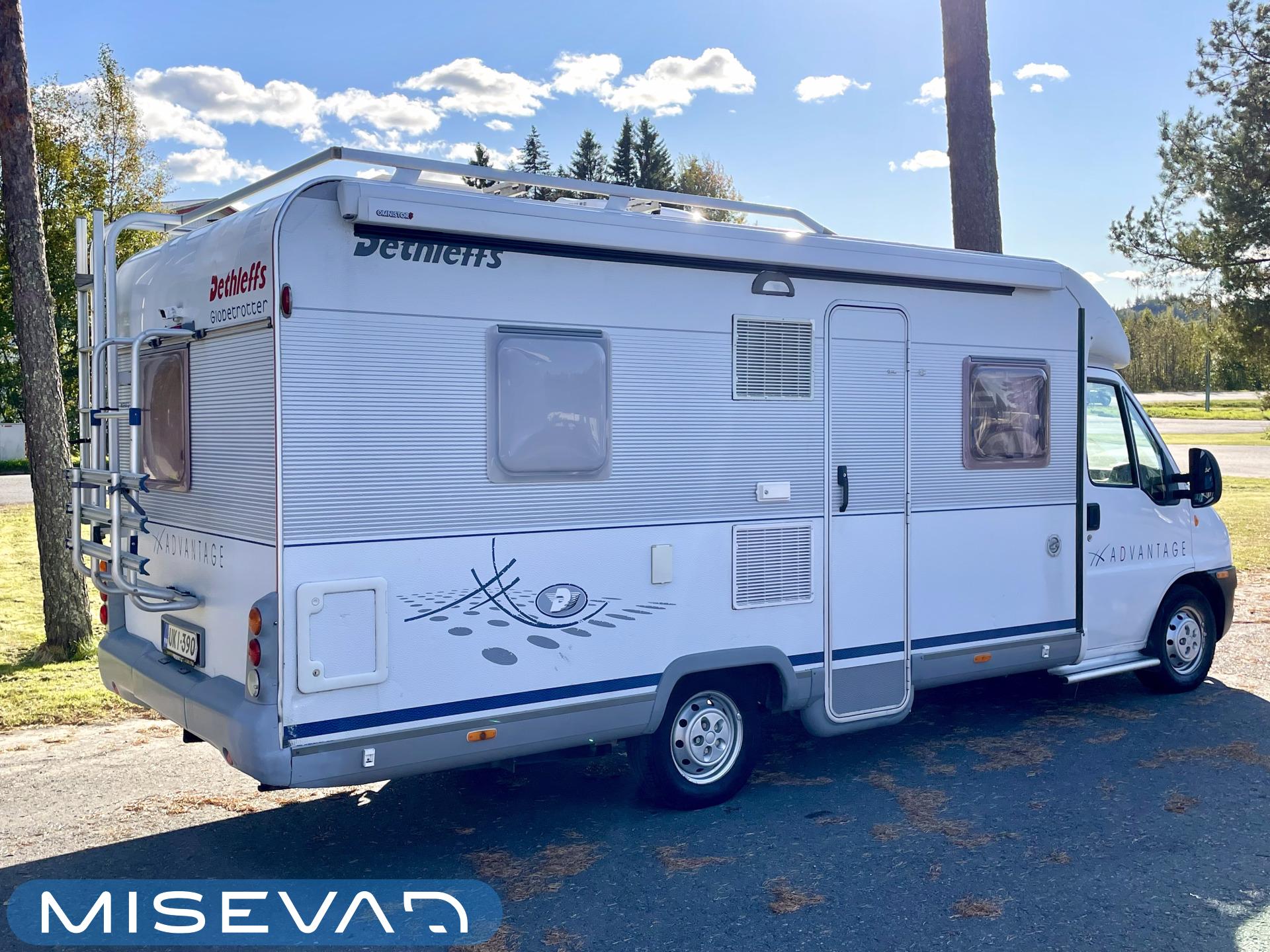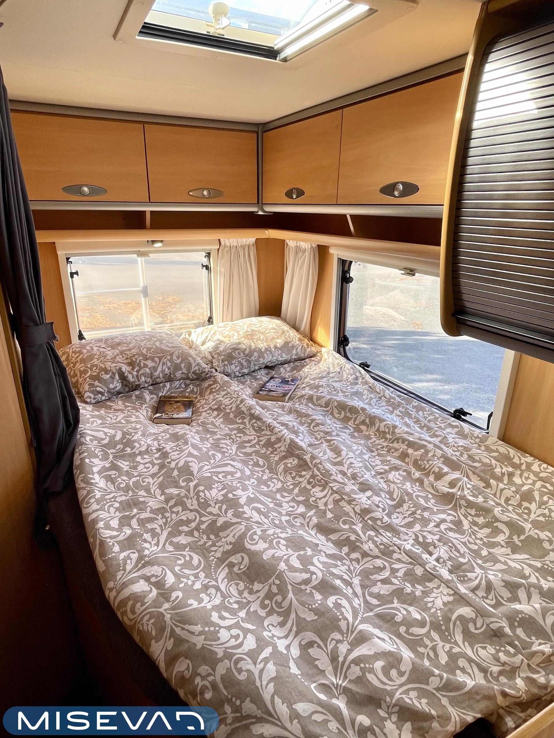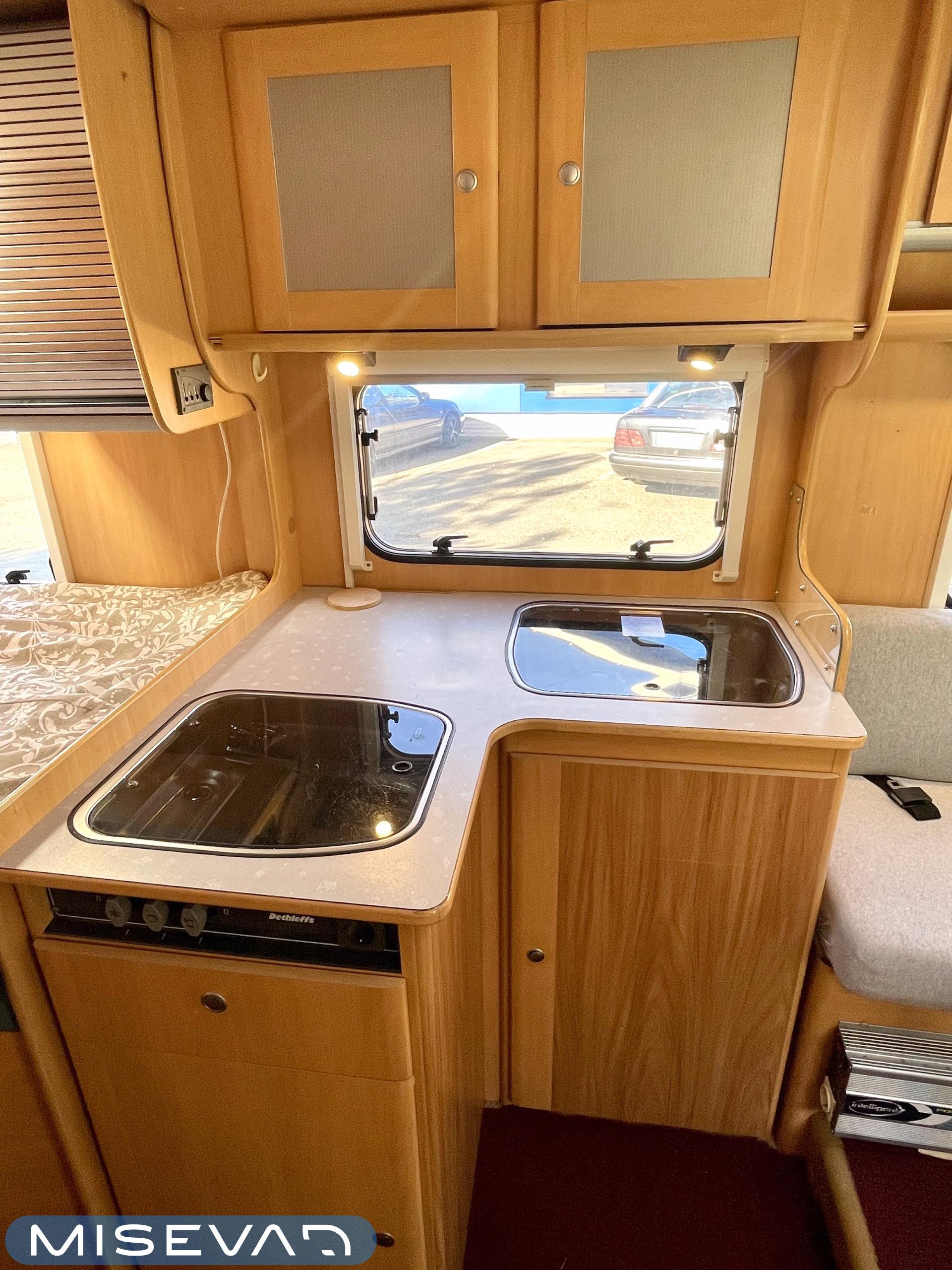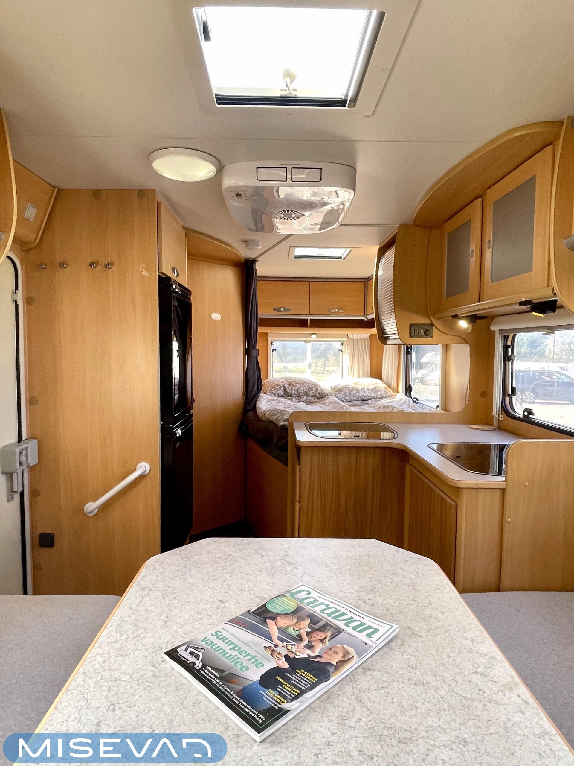 Tässä Dethleffsissä riittää varusteita. Asuinosaa on tuotu tähän päivään myös asentamalla kaksi kompressorikaappia keittiöön. On sinun päätettävissä käyttääkö reissuissa molempia vai pärjääkö vain yhdellä. Tilaa ruoansäilytykseen on reilusti. Keittiö itsessään on myös L-muotoinen, joten kokilla on oma rauha kokkailuun. Altaan ja lieden väliin jääkin loistava laskutila ruoanvalmistusta varten. Etuosassa autoa on iso ruokailutila neljälle ja kun edessä olevat penkit kääntää, niin pöydän ympärille mahtuu kuusikin henkilöä. Takaa löytyy vaatekomeron lisäksi wc- ja suihkutila. Ulkosuihku onnistuu myös kylpyhuoneen ikkunan kautta. Makuupaikat löytyy pehmeältä parisängyltä. Jonka alla on lisäksi vielä säilytystilaa takatallin muodossa. Tavaroita pääsee noukkimaan nostamalla sängyn tai ulkoluukun kautta. Oli kesä tai talvi, tämä auto on varustettu molempia vuodenaikoja ajatellen. Alde lämmittää ja Klarstein viilentää.