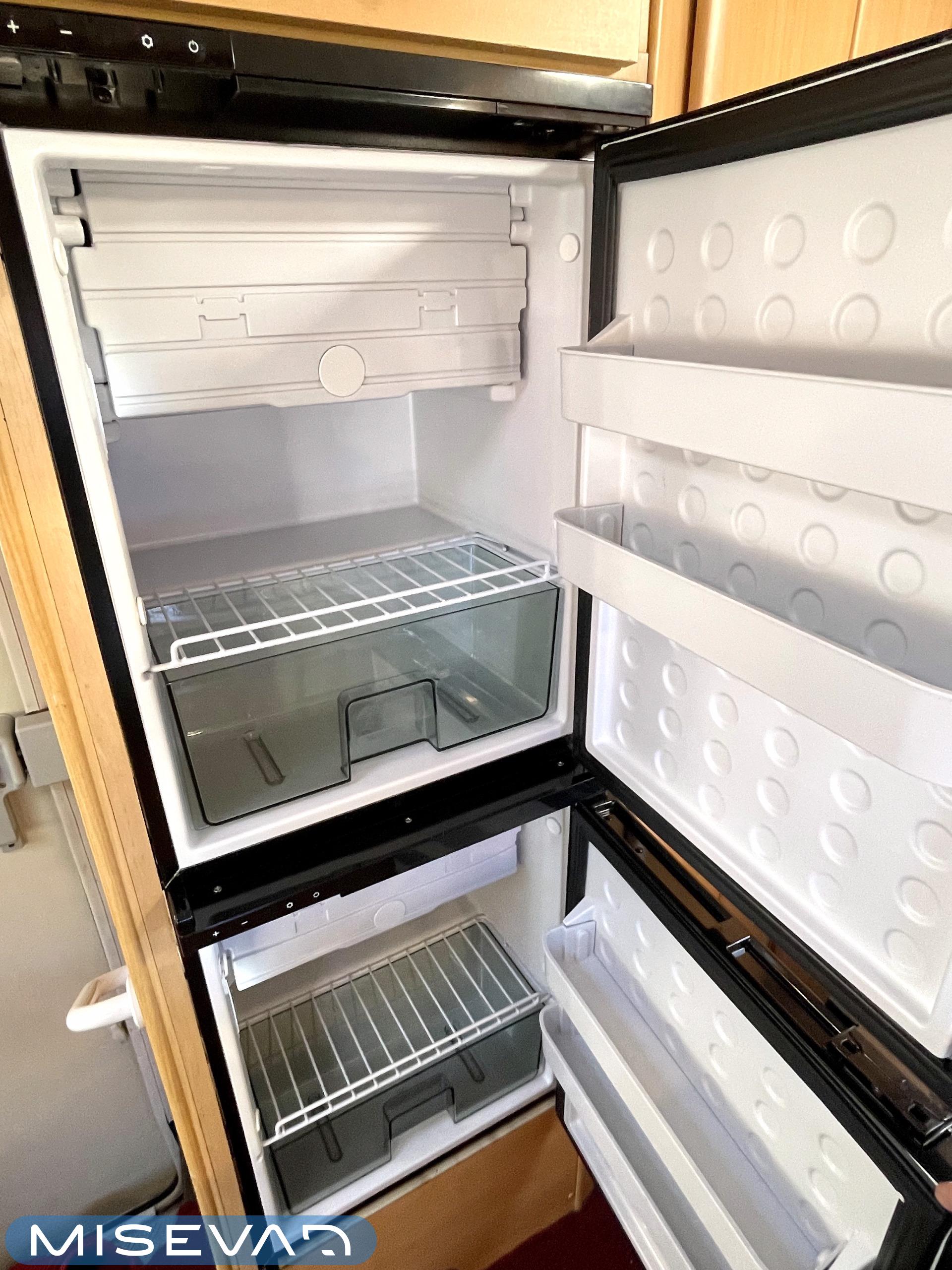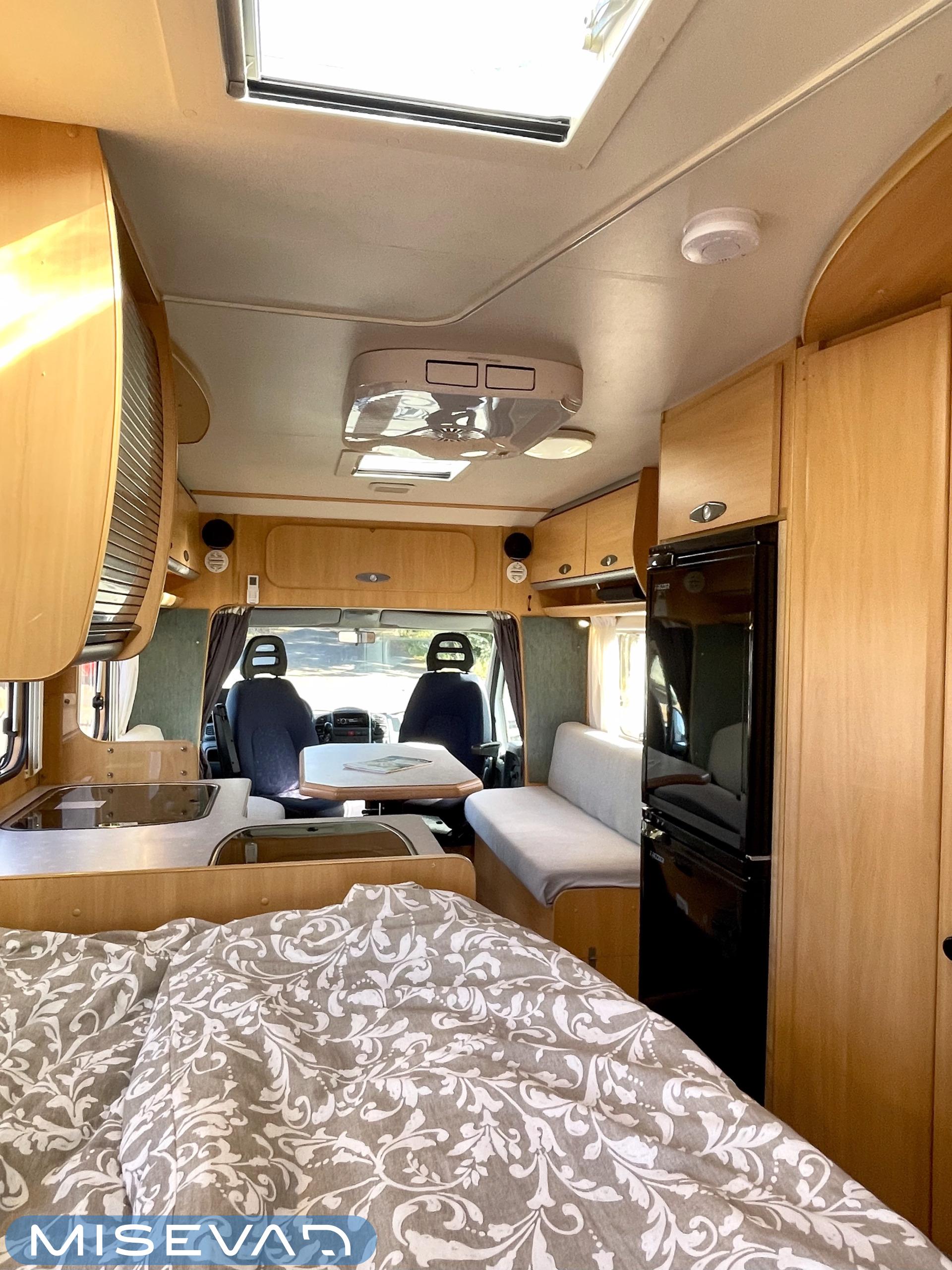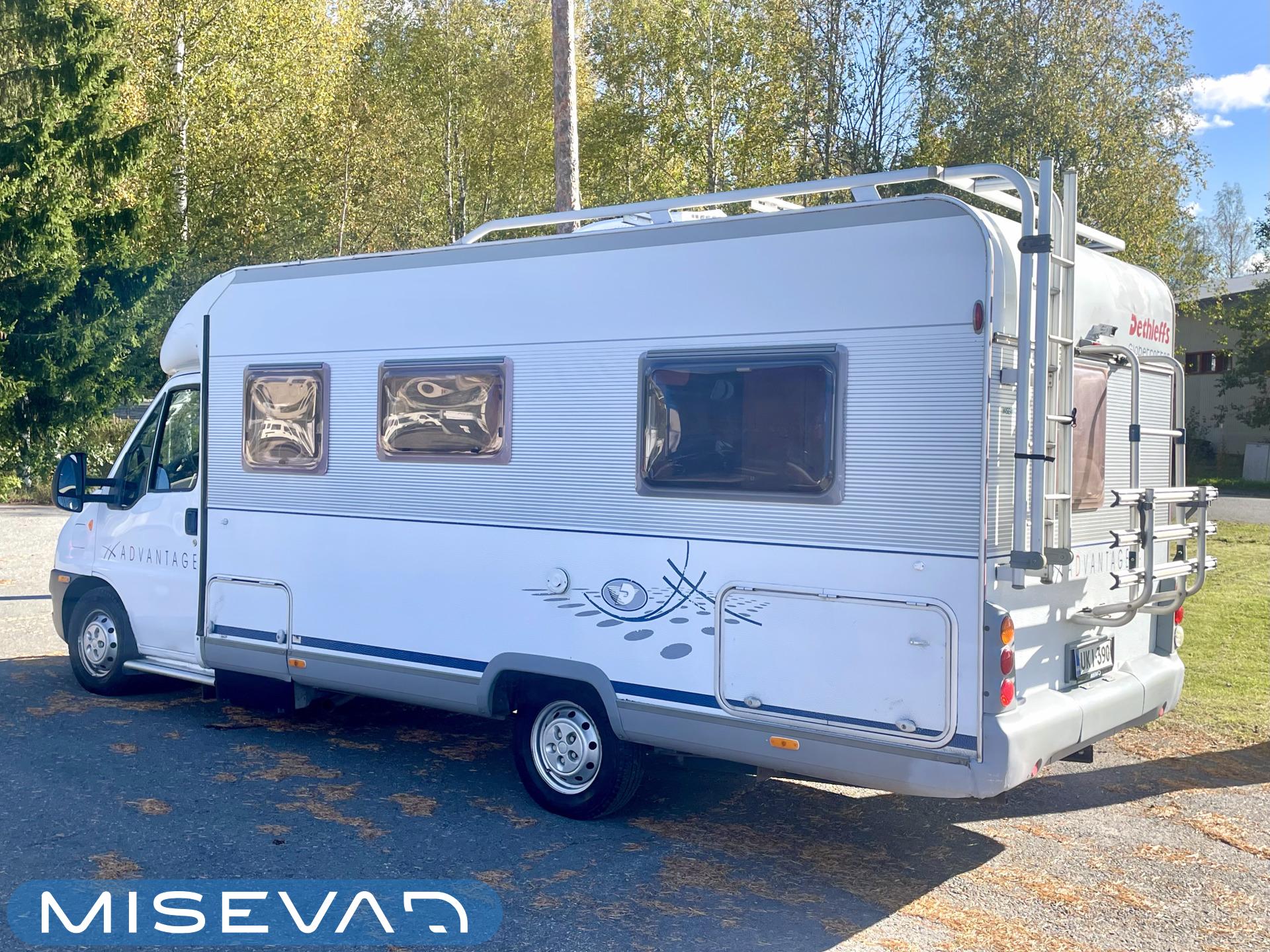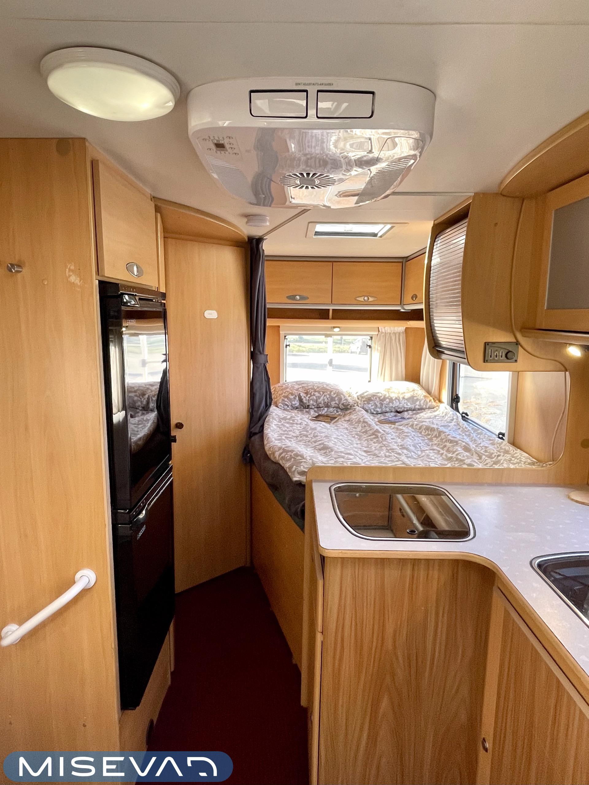 Tässä Dethleffsissä riittää varusteita. Asuinosaa on tuotu tähän päivään myös asentamalla kaksi kompressorikaappia keittiöön. On sinun päätettävissä käyttääkö reissuissa molempia vai pärjääkö vain yhdellä. Tilaa ruoansäilytykseen on reilusti. Keittiö itsessään on myös L-muotoinen, joten kokilla on oma rauha kokkailuun. Altaan ja lieden väliin jääkin loistava laskutila ruoanvalmistusta varten. Etuosassa autoa on iso ruokailutila neljälle ja kun edessä olevat penkit kääntää, niin pöydän ympärille mahtuu kuusikin henkilöä. Takaa löytyy vaatekomeron lisäksi wc- ja suihkutila. Ulkosuihku onnistuu myös kylpyhuoneen ikkunan kautta. Makuupaikat löytyy pehmeältä parisängyltä. Jonka alla on lisäksi vielä säilytystilaa takatallin muodossa. Tavaroita pääsee noukkimaan nostamalla sängyn tai ulkoluukun kautta. Oli kesä tai talvi, tämä auto on varustettu molempia vuodenaikoja ajatellen. Alde lämmittää ja Klarstein viilentää.