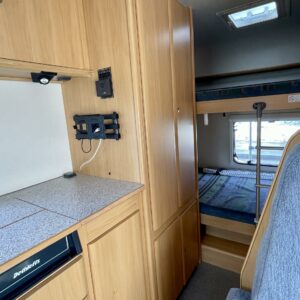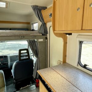 Takana poikittaiset kerrosvuoteet ja alemman vuoteen ylös nostamalla saadaan käyttöön takatalli. Keskellä keittiö ja WC/kylpyhuonetilat. Edessä vastakkain istuttava pöytäryhmä mistä voidaan sijata vuode kahdelle henkilölle. Ohjaamon päällä alkovivuode kahdelle henkilölle.