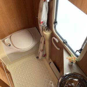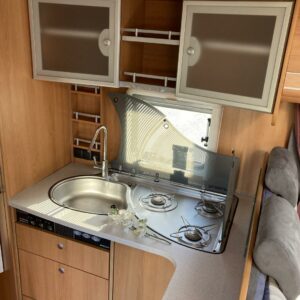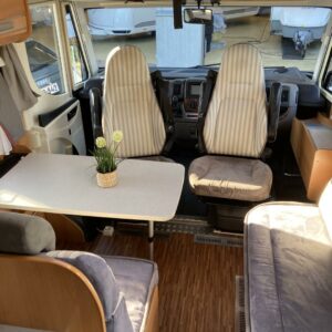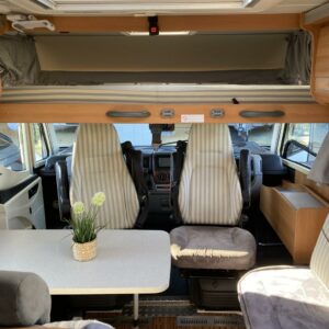 Takana parivuode pitkittäin ja vieressä tilava pesuhuone, keskellä keittiö isolla jääkaapilla ja mikrolla,edessä istuinryhmä 6:lle kääntyvin ohjaamon penkein, ohjaamon päällä alaslaskettava parivuode.