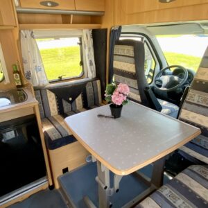 Takana pitkittäinen parivuode ja WC/kylpyhuonetilat. Keskellä L-keittiö, sekä säilytystiloja. Edessä vastakkain istuttava pöytäryhmä minne yhdistyvät kääntyvät ohjaamon penkit.