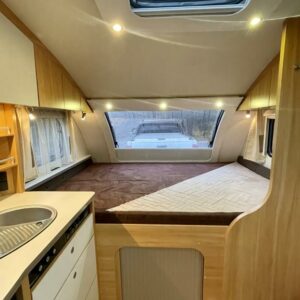 Pohjaratkaisussa edessä poikittainen parivuode. Keskiosassa sohvaryhmä joka pedattavissa vuoteeksi, keittiö sekä Wc & Suihkutila. Takaosassa toinen sohvaryhmä ja L- muotoinen ylävuode kahdelle pikkunukkujalle.
