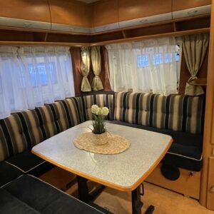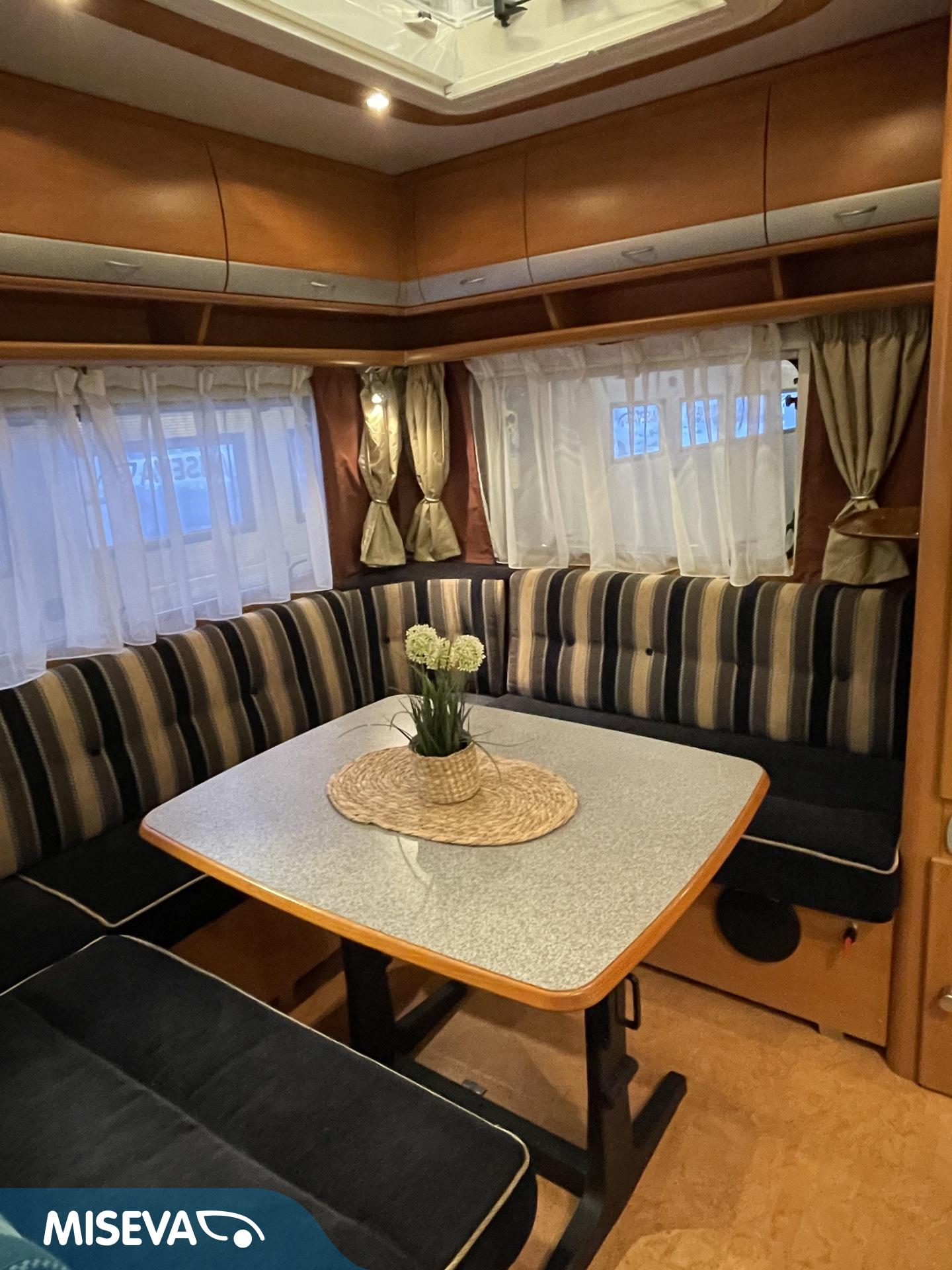 Erittäin kotoisa matkailuvaunu isolla parisänky ratkaisulla, joka ei vaadi kiipeilyä ja antaa todellista tilan tuntua.