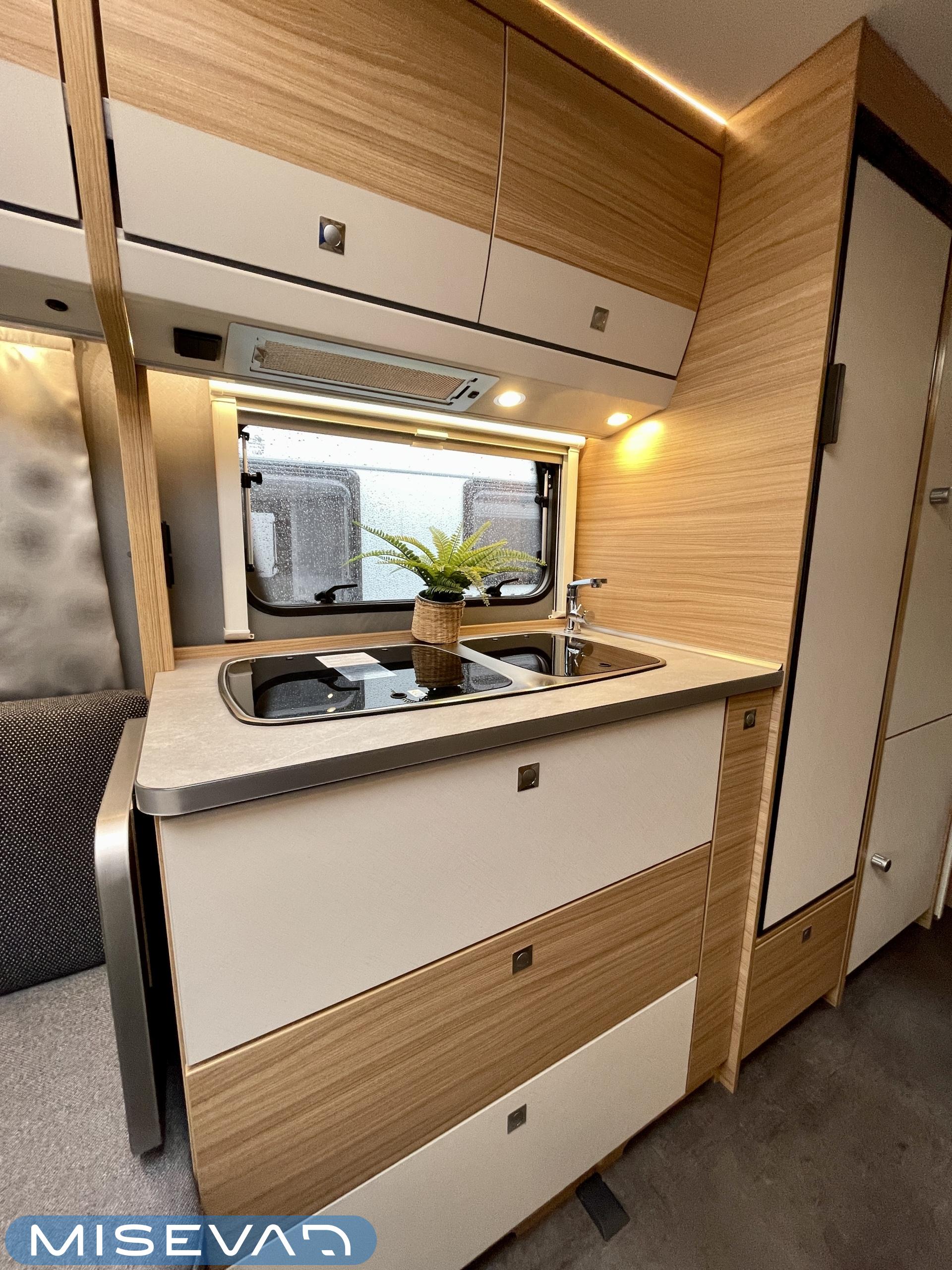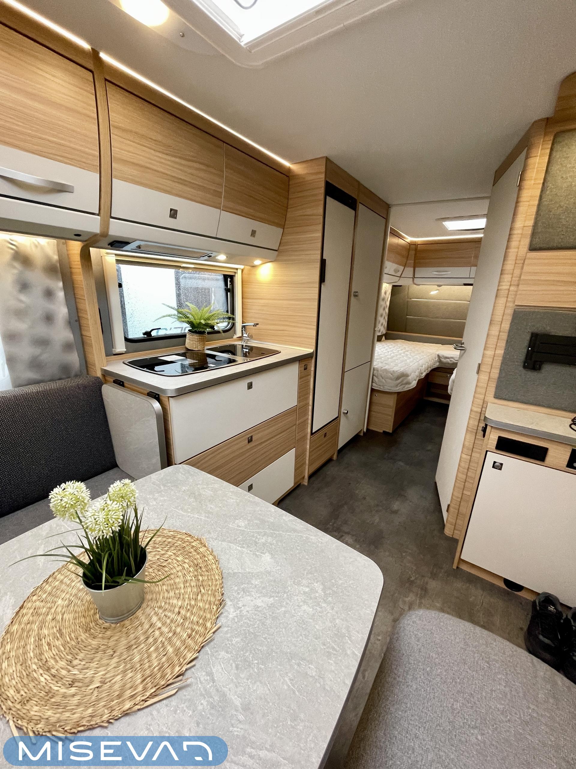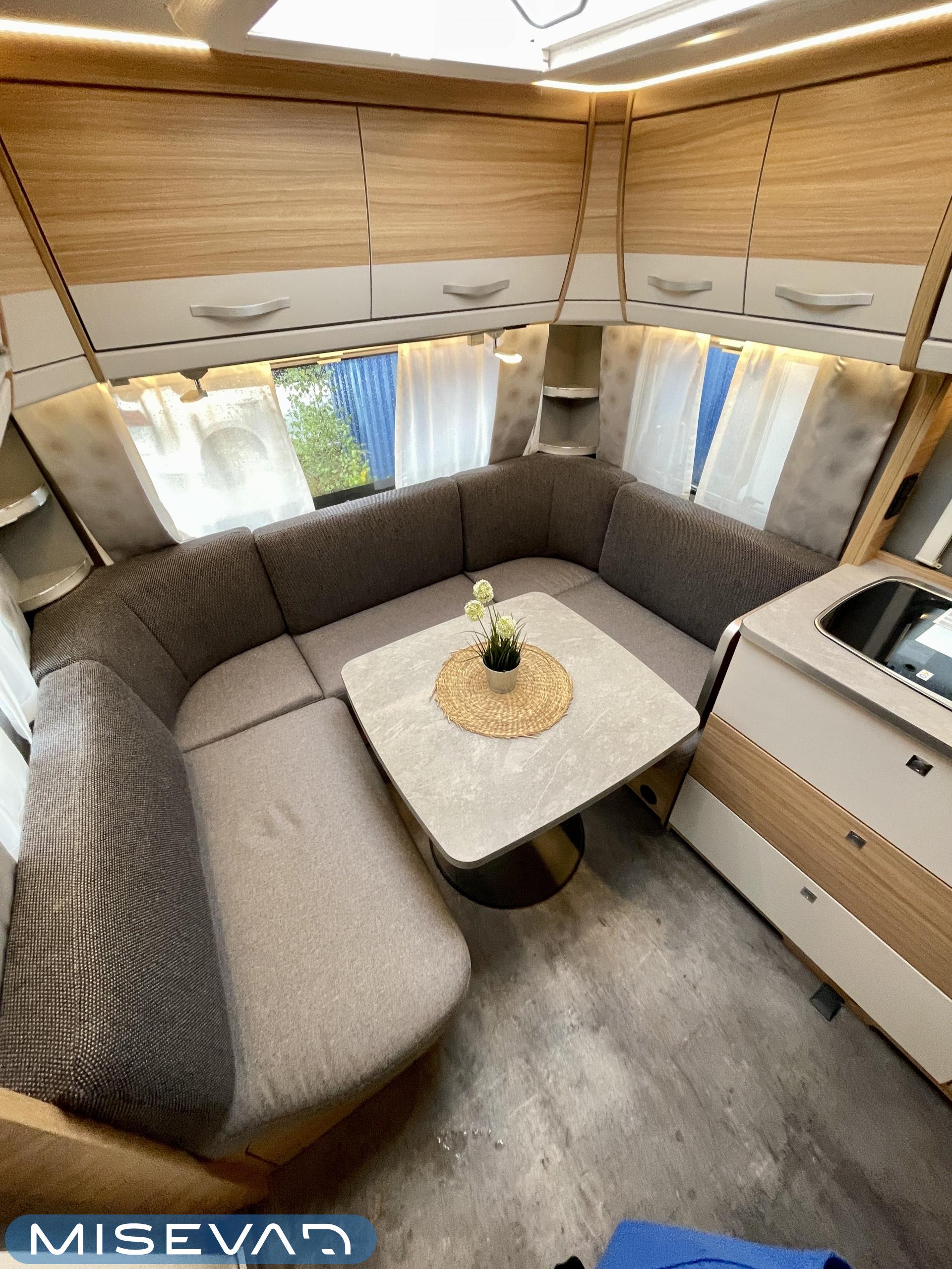Kevyt vetää, mutta kokonsa puolesta myös loistava vaihtoehto kausipaikalle. Varusteluun kuuluu tehokas Truma 4E -lämmitin, tilava U-ryhmä, avara keittiö sekä iso jääkaappi. Kaikin puolin huolella pidetty ja siisti vaunu, valmiina uusiin reissuihin.
