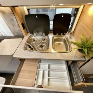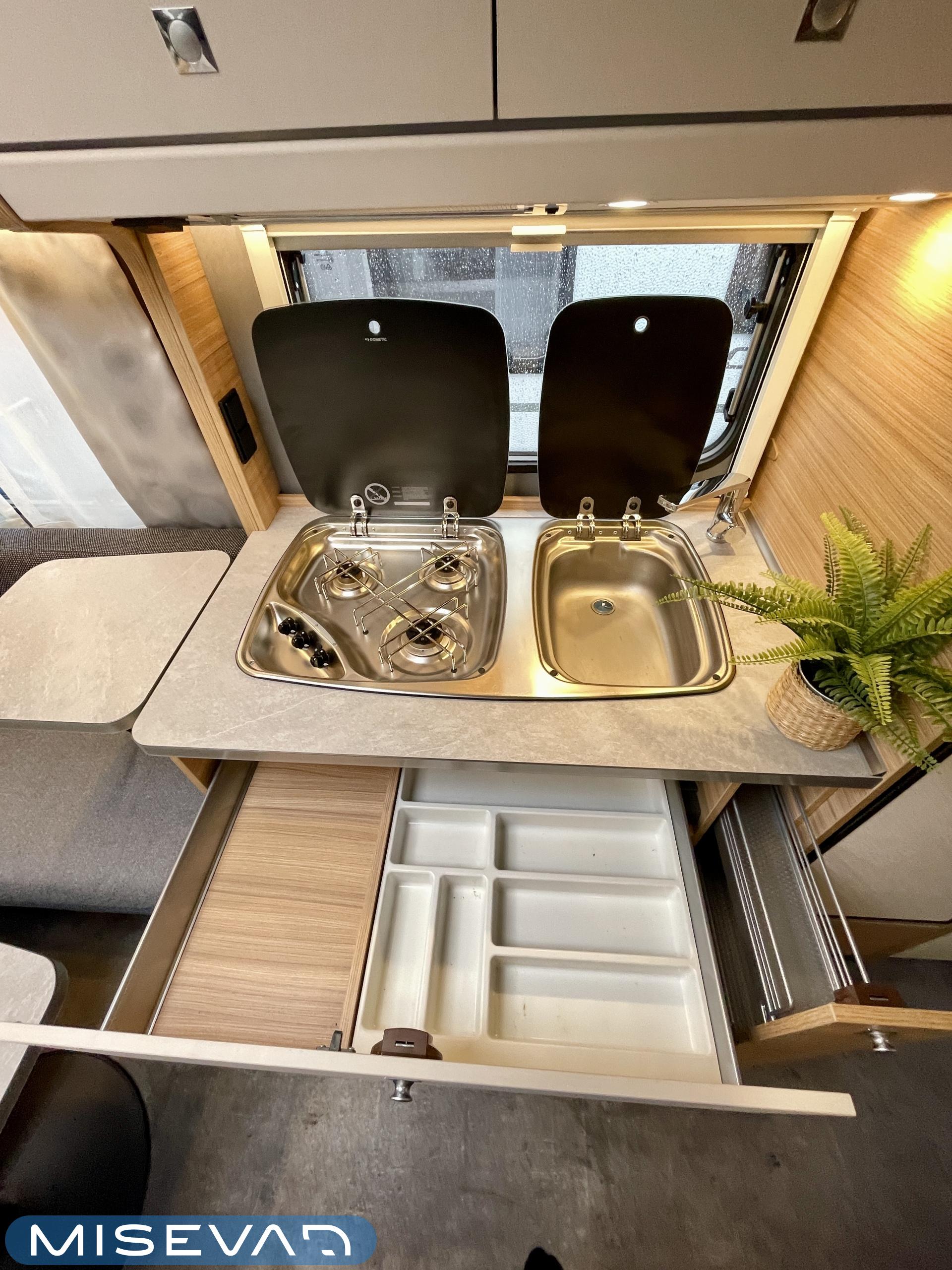 TV- antenni, Pesuallas, Liesituuletin, Liesi, Kattoluukku, Kasetti- WC, Jääkaappi, Aurinkopaneeli, Truma, Sähköpatruuna, Erillisvuoteet, Kasetti WC, Kasettiverhot, Lattialämmitys, Lattiamatot asunto-osassa, Lämminvesiboileri, Pakastelokero, TV-antenni tai lautasantenni, Tukijalat, Lattialämmitys (sähkö), jenkkijääkaappi, pullonvaihtaja, televisioteline, Asuinosan hyttysovi/verho, Lämmittimenä Truma Combi4E