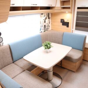 Näppärän kokoinen perhevaunu. Takana kerrosvuoteet pitkittäin ja kylpyhuone/WC, keskellä keittiö ja U-istuinryhmä johon mahdollista pedata lisävuode, edessä parivuode poikittain. Nukkumapaikat jopa 6:lle…