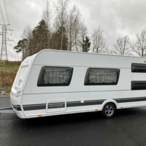 Näppärän kokoinen perhevaunu. Takana kerrosvuoteet pitkittäin ja kylpyhuone/WC, keskellä keittiö ja U-istuinryhmä johon mahdollista pedata lisävuode, edessä parivuode poikittain. Nukkumapaikat jopa 6:lle…
