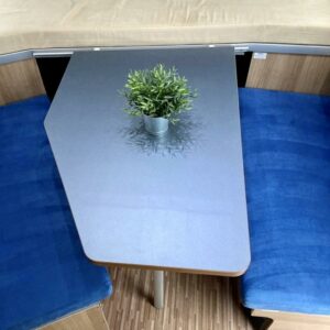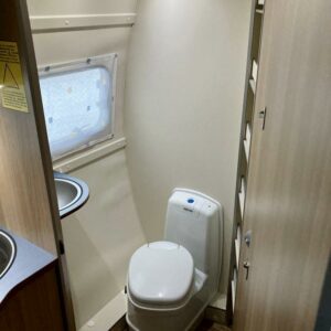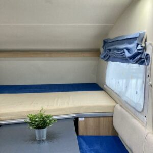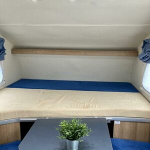 Edessä parivuode ja alla iso tavaratila, istuinryhmä ja takana päätykeittiö ja kulmassa pesuhuone wc:llä.