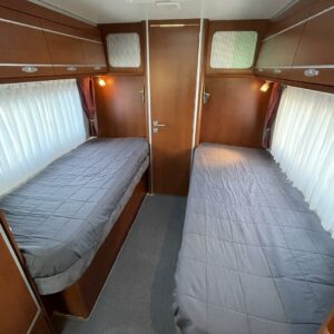 Upea erillisvuoteinen isolla pesuhuoneella ja avaralla pöytäryhmällä. Tasokas ja näyttävä Esprit- varusrelu. Edessä avara istuinryhmä sivusohvalla, keskellä keittiö kätevillä laatikostoilla ja suurella jääkaapilla, peremmällä leveät erillisvuoteet ja takana valtava pesuhuone erillisellä suihkutilalla.