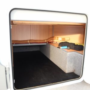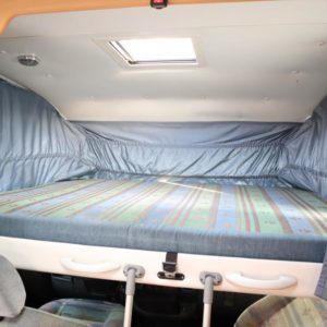 Pitkittäisellä parivuoteella varustettu Integroitu Dethleffs. Hyvät vuoteet 4:lle. Parivuoteen alla tilava tavaratila pitkillekin tavaroille.
