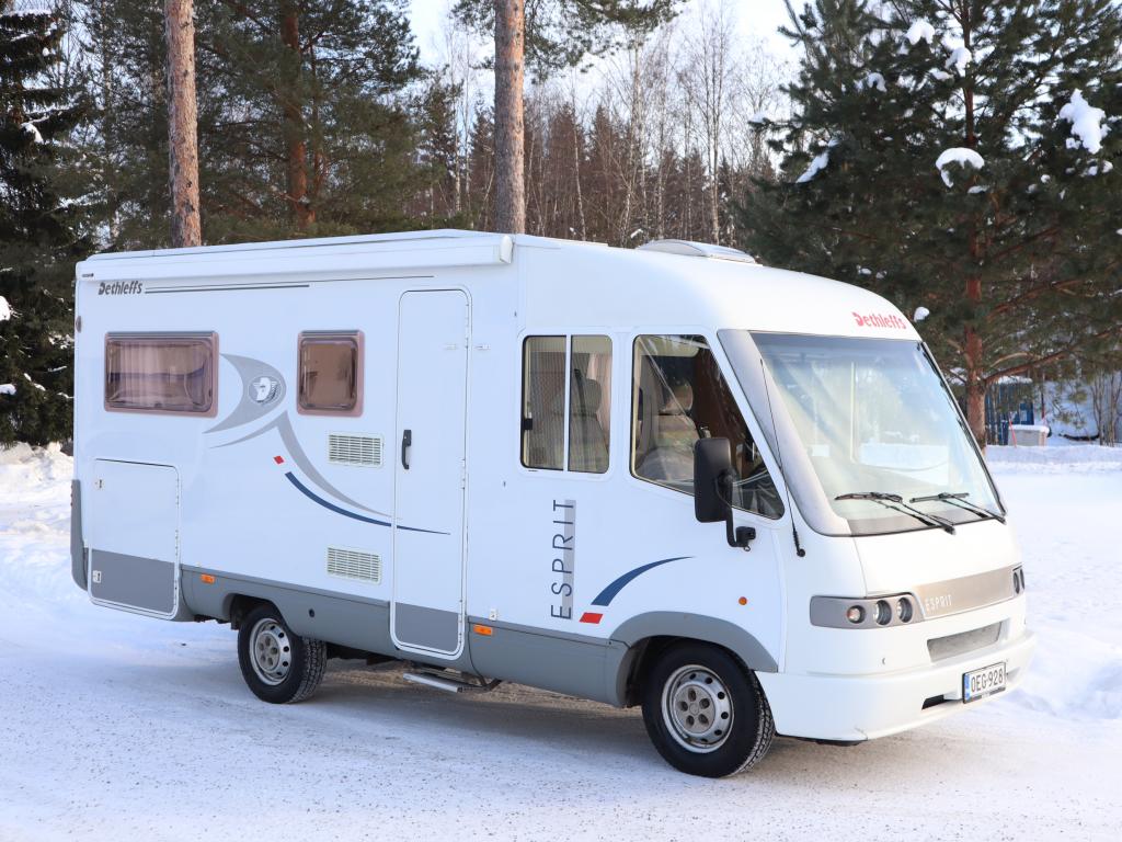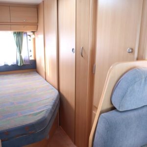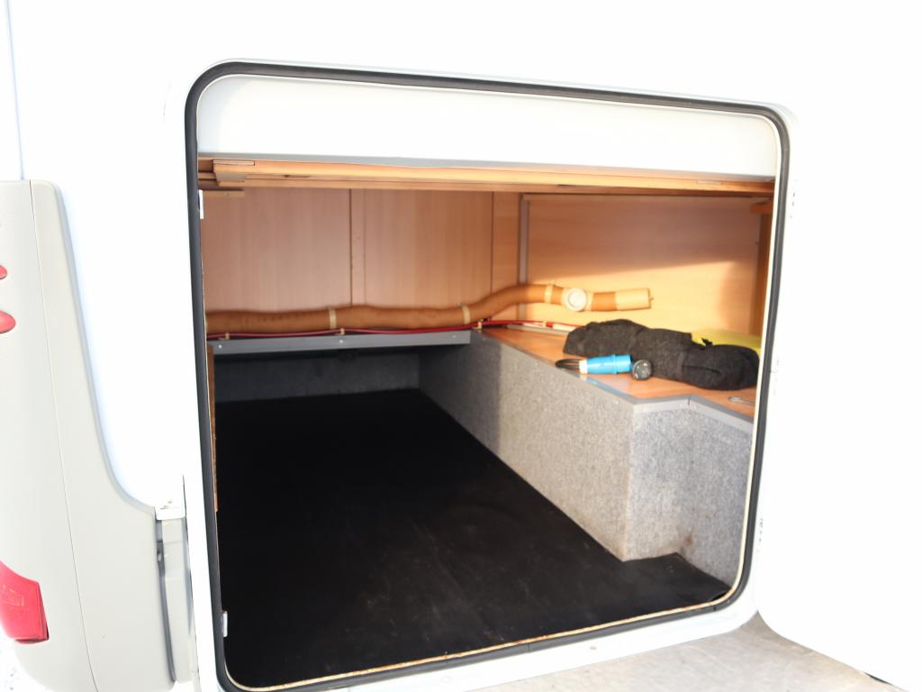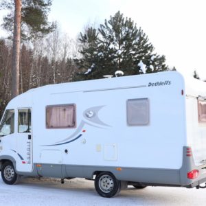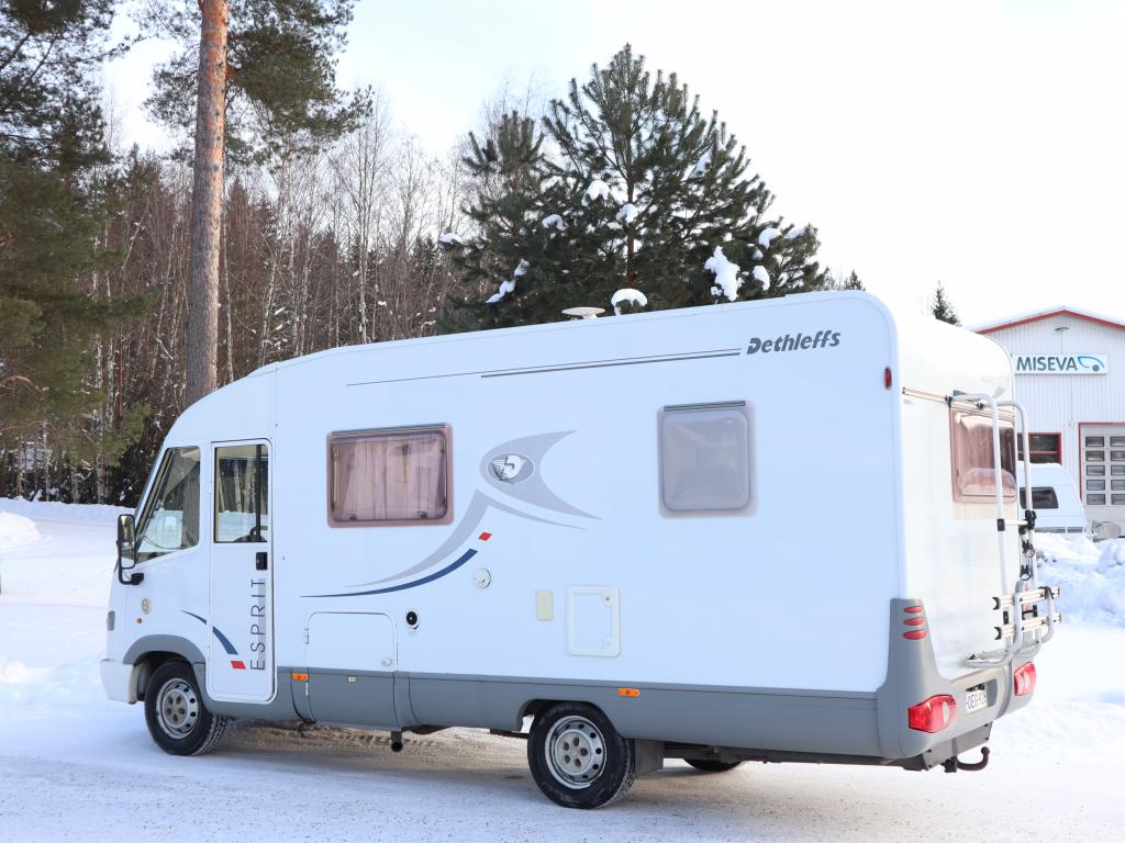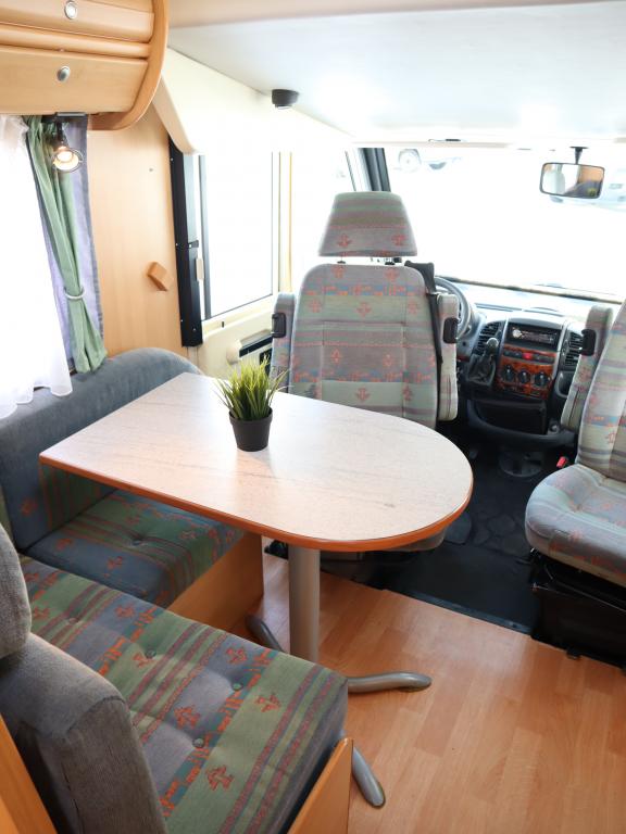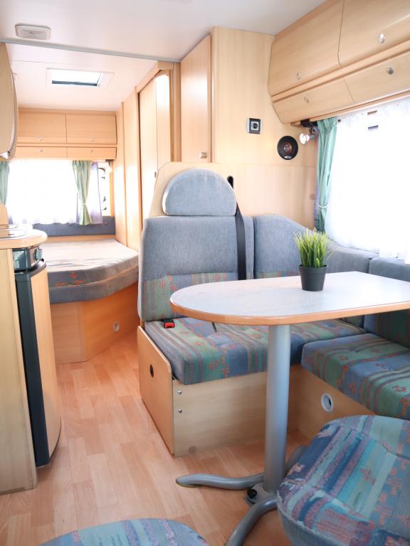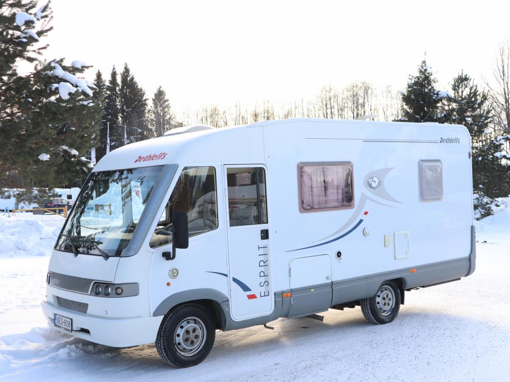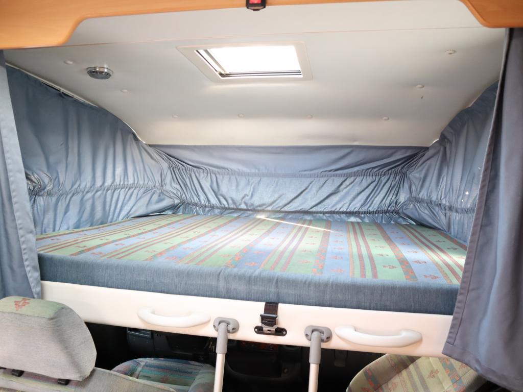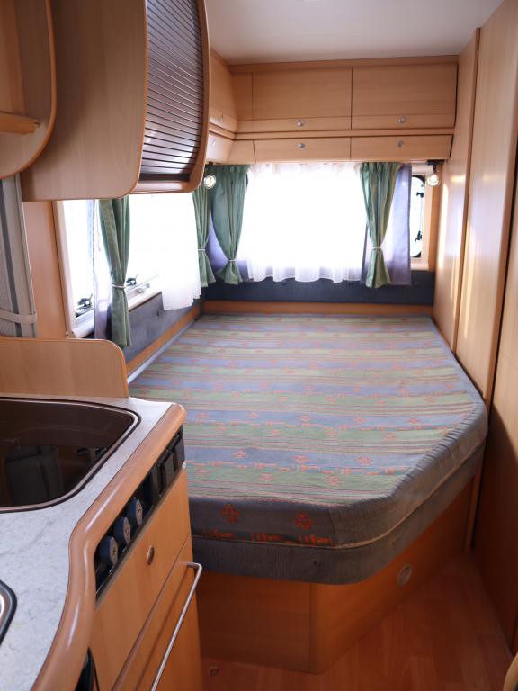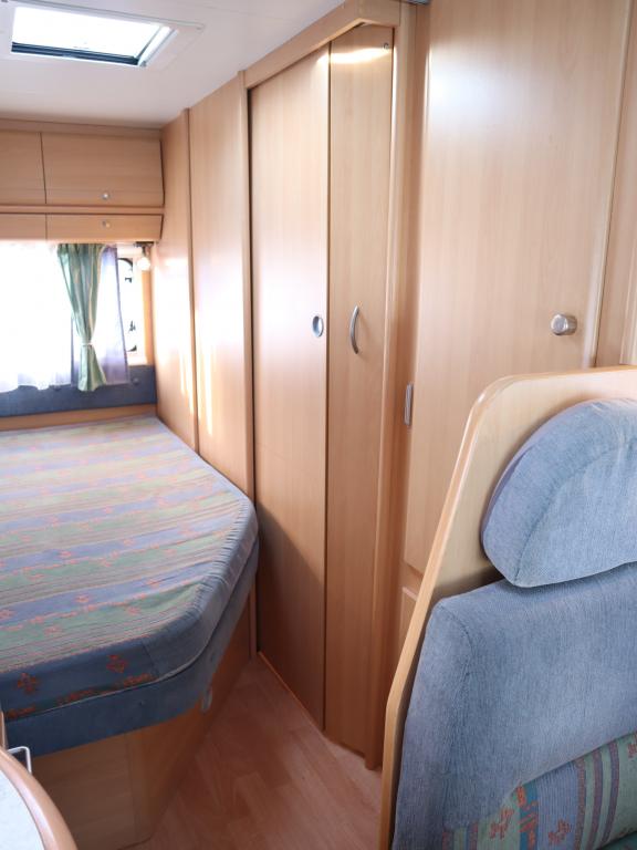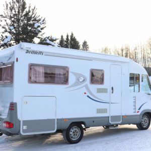 Pitkittäisellä parivuoteella varustettu Integroitu Dethleffs. Hyvät vuoteet 4:lle. Parivuoteen alla tilava tavaratila pitkillekin tavaroille.