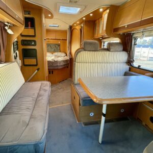 7 m kokonaispituus tuo sisätiloihin kaivattua avaruutta. Auton etuosassa on valoisa ja viihtyisä pöytäryhmä sivusohvalla.