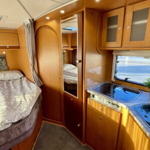 Auton keskikivaiheilta löytyy tyylitelty L- keittiö isolla jääkaappi- pakastimella varustettuna.