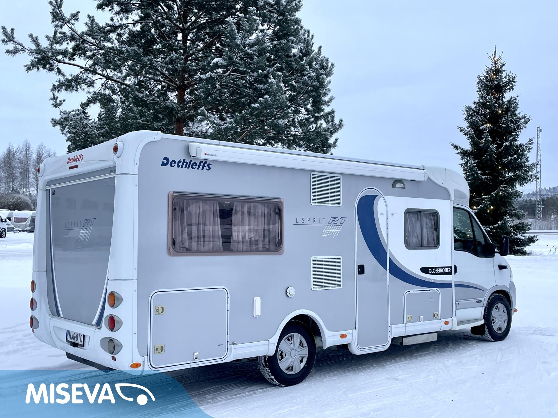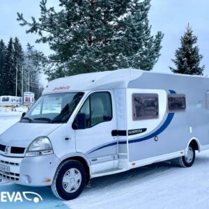 Tyylikäs Renault- alustainen Dethleffs kattavasti varusteltuna. Ilmastoinnin ja nestekeskuslämmityksen ansiosta tällä matka- kodilla pärjää niin kesähelteillä kuin talvipakkasillakin.