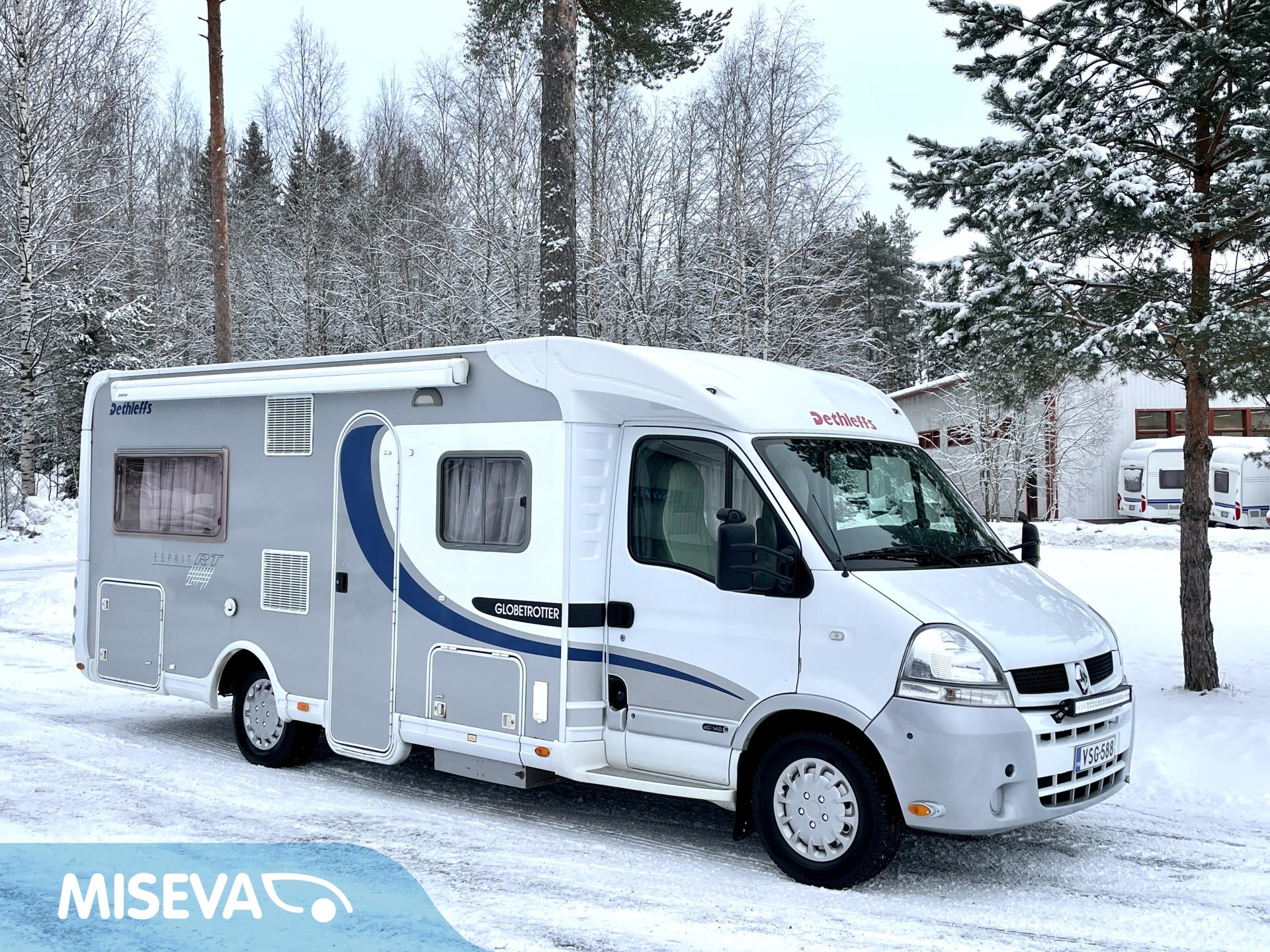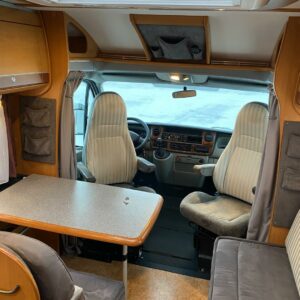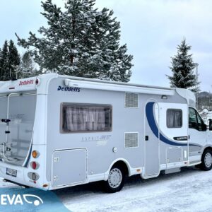 Dethleffsin puoli-integroitu matkailuauto toimivalla ja avaralla pohjaratkaisulla. Iso pöytäryhmä minne yhdistyy kääntyvät ohjaamon penkit, sekä sivusohva. Pöytäryhmästä saa eri variaatioilla lisävuoteen aikuiselle tai useammalle lapselle. Pöytäryhmän päällä on iso kattoluukku mikä antaa mukavasti valoa sisätiloihin. Keittiössäkin on hyvin tilaa työskennellä ja keittiövarustuksen kruunaa iso jääkaappi tilavalla erillisellä pakastinlokerolla. WC/kylpyhuoneosiosta löytyy oma erillinen suihkutila. Lämmitysjärjestelmänä Trumaticin ilmakeskuslämmitys ja sähkövastuksilla varusteltuna. Mukava lisä on myös sähkötoiminen lattianlämmitys. Takaseinällä olevaan polkupyörätelineeseen saa fillaritkin mukaan parille henkilölle. Pieni invertteri löytyy vaikka tietokoneen käyttöä varten.