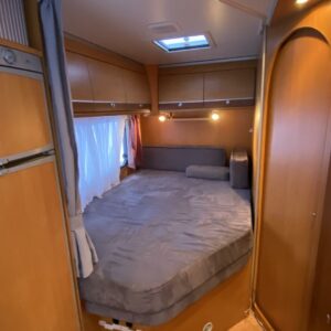 Pohjaratkaisussa takana pitkittäinen parivuode minkä alapuolella hyvin säilytystilaa. Toisella puolella tilavat WC/kylpyhuonetilat erillisellä suihkutilalla. Keskellä avara keittiö isolla jääkaapilla, sekä säilytystiloja. Edessä iso pöytäryhmä mistä saa tarvittaessa sijattua vuoteen.
