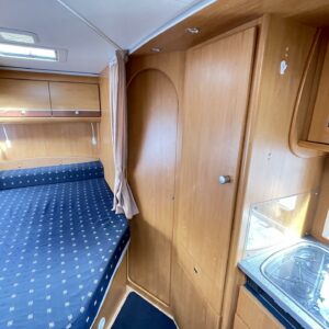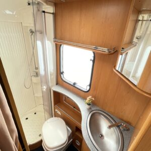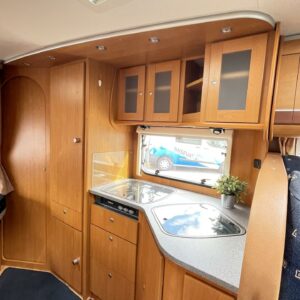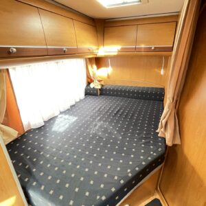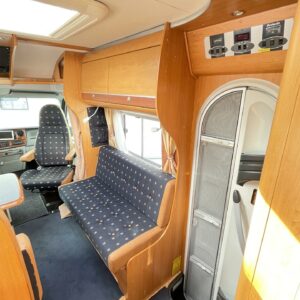Avara pohjaratkaisu, nukkumapaikat 4:lle, erillinen suihku. Takana parivuode pitkittäin ja vieressä wc-tila erillisellä suihkulla. Keskellä keittiö. Edessä pöytäryhmä jopa 6:lle kääntyvin ohjaamoistuimin.