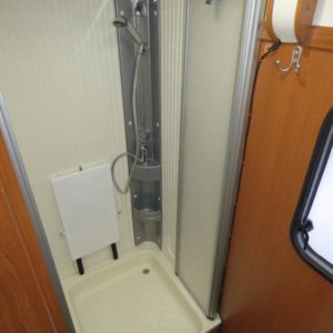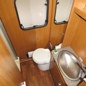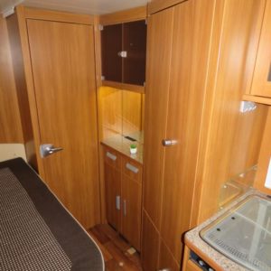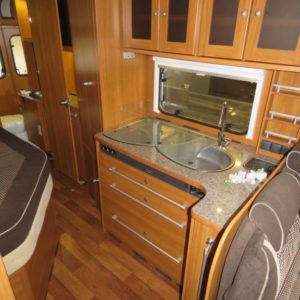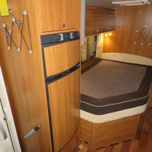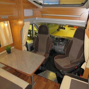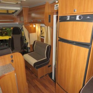 Autossa perällä suuri erillinen suihkutila ja wc. Keskellä pitkittäinen parivuode, L- keittiö, tilava jääkaappi sekä reilusti kaappitilaa. Edessä pöytäryhmä sivusohvalla sekä kääntyvillä etuistuimilla.
