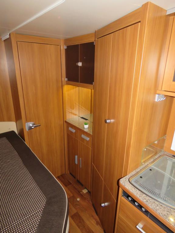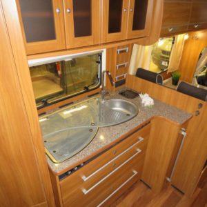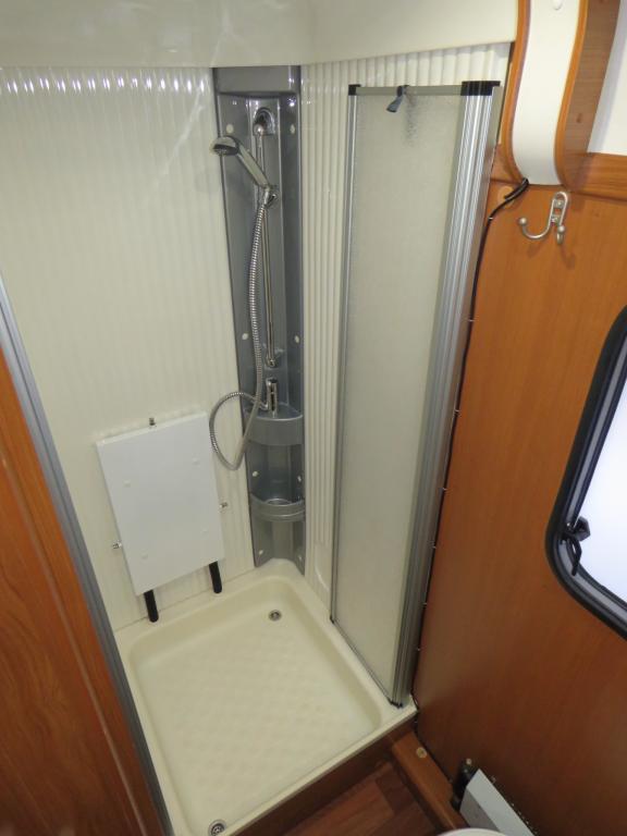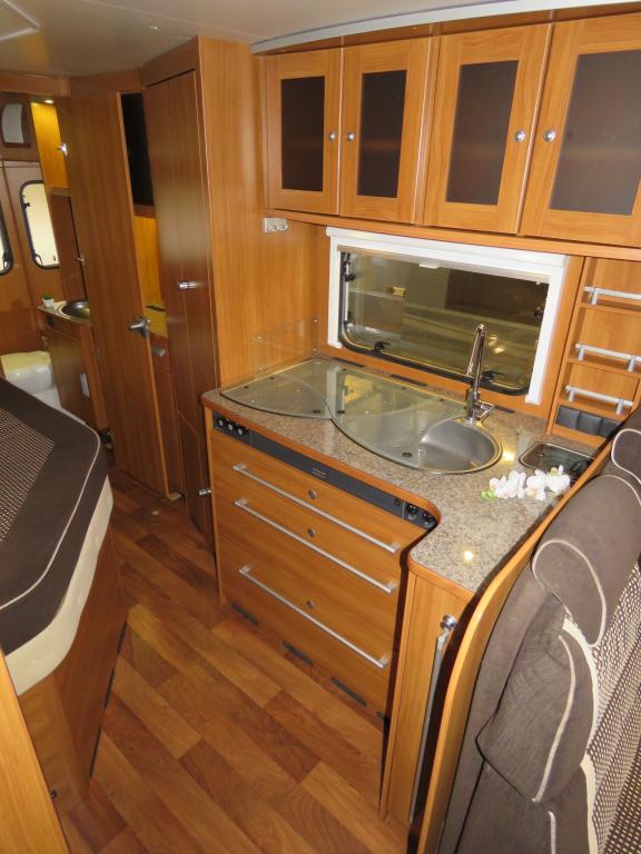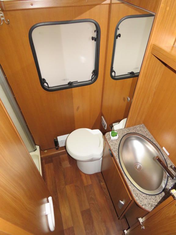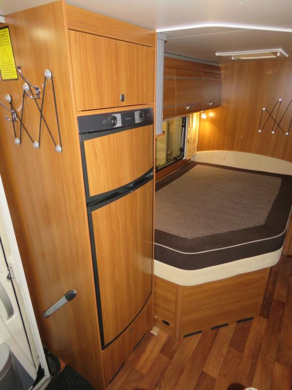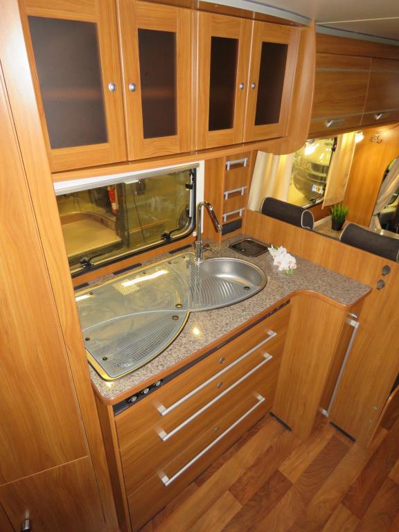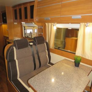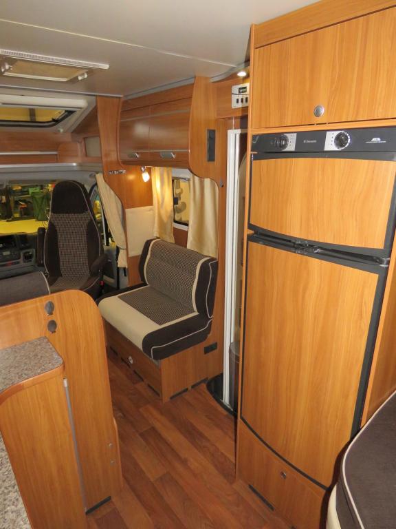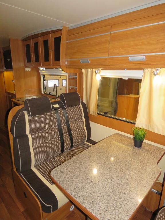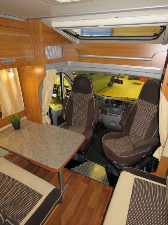 Autossa perällä suuri erillinen suihkutila ja wc. Keskellä pitkittäinen parivuode, L- keittiö, tilava jääkaappi sekä reilusti kaappitilaa. Edessä pöytäryhmä sivusohvalla sekä kääntyvillä etuistuimilla.