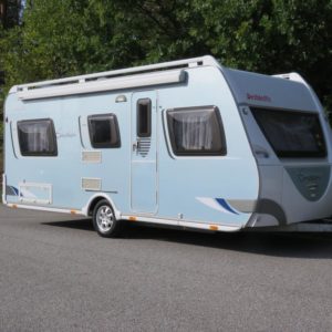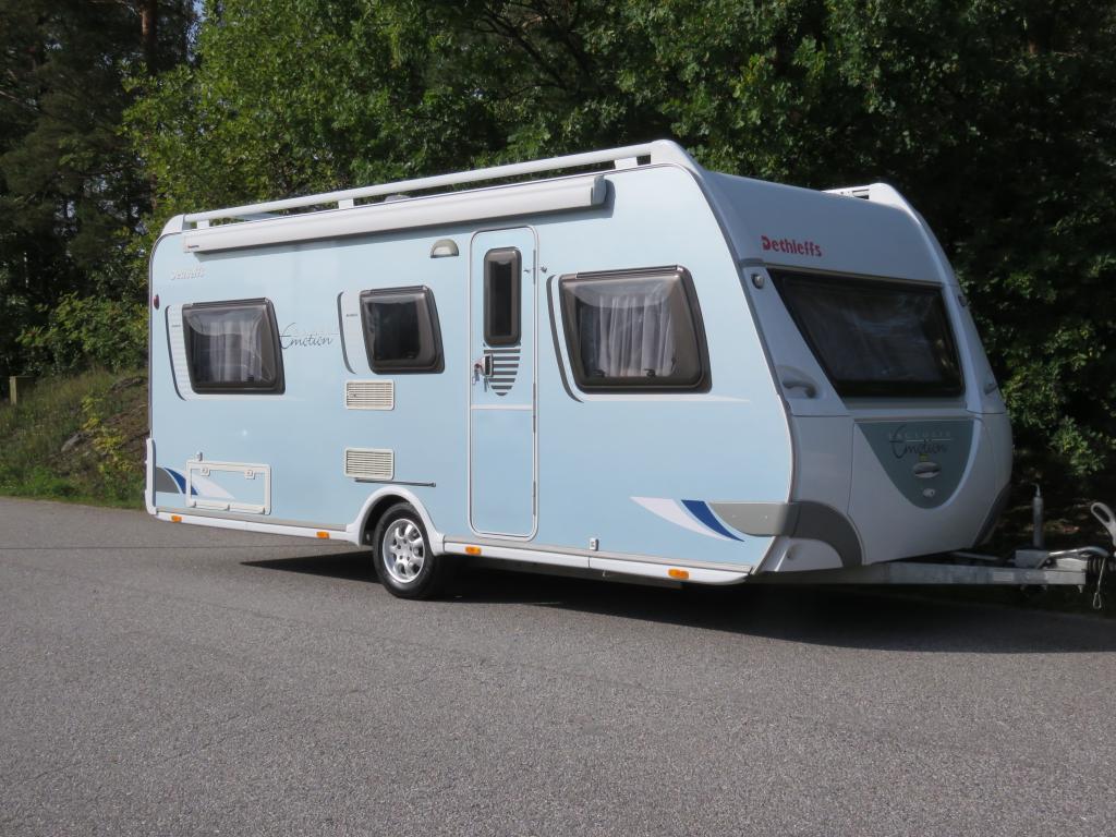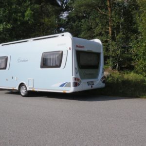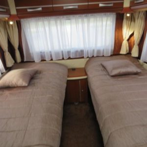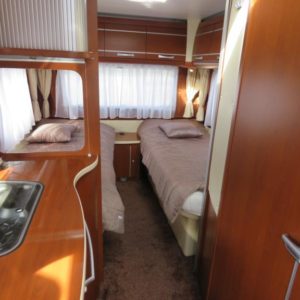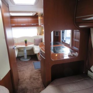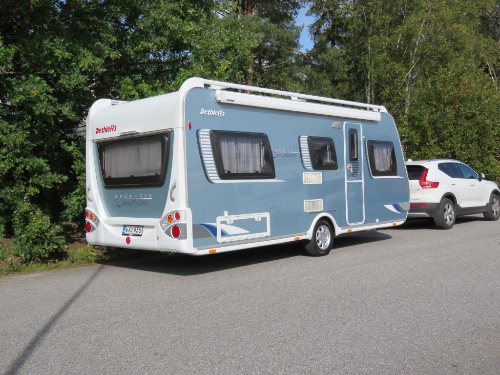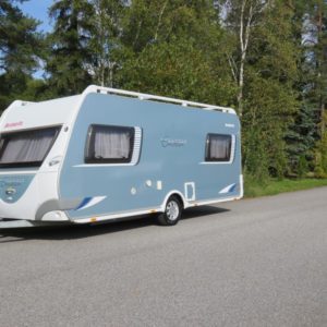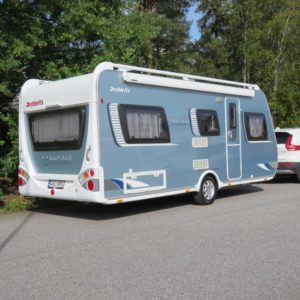 Hieno. Takana erillisvuoteet, keskellä pesuhuone ja keittiö ja edessä valoisa olohuone. Varusteina mm. Alde,