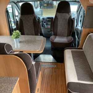 Takana parivuode pitkittäin ja vieressä tilava pesuhuone, keskellä keittiö isolla jääkaapilla edessä istuinryhmä 6:lle kääntyvin ohjaamon penkein. ja päällä alaslaskuvuode