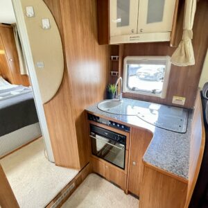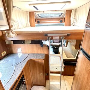 Toimiva L- keittiö kaasu- uunilla ja isolla jääkaappi- pakastimella varustettuna on auton keskivaiheilla. Lisää makuupaikkoja tarjoaa katosta laskeutuva nostovuode.