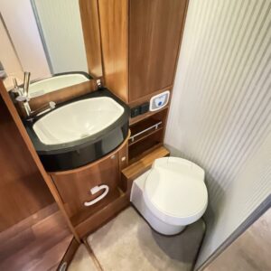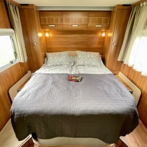 Auton takaosasta löytyy muhkea saarekevuode ja erilliset WC-/ suihkutilat. Takaosan saa erotettua muusta asunto- osasta liukuoven avulla.