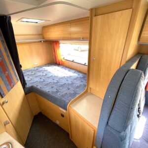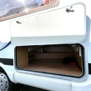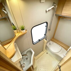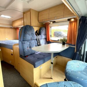 Takana parivuode pitkittäin matalalla, alla iso tavaratila ja vieressä tilava pesuhuone. Edessä valoisa pöytäryhmä kääntyvin istuimin.