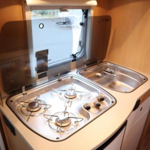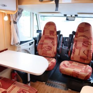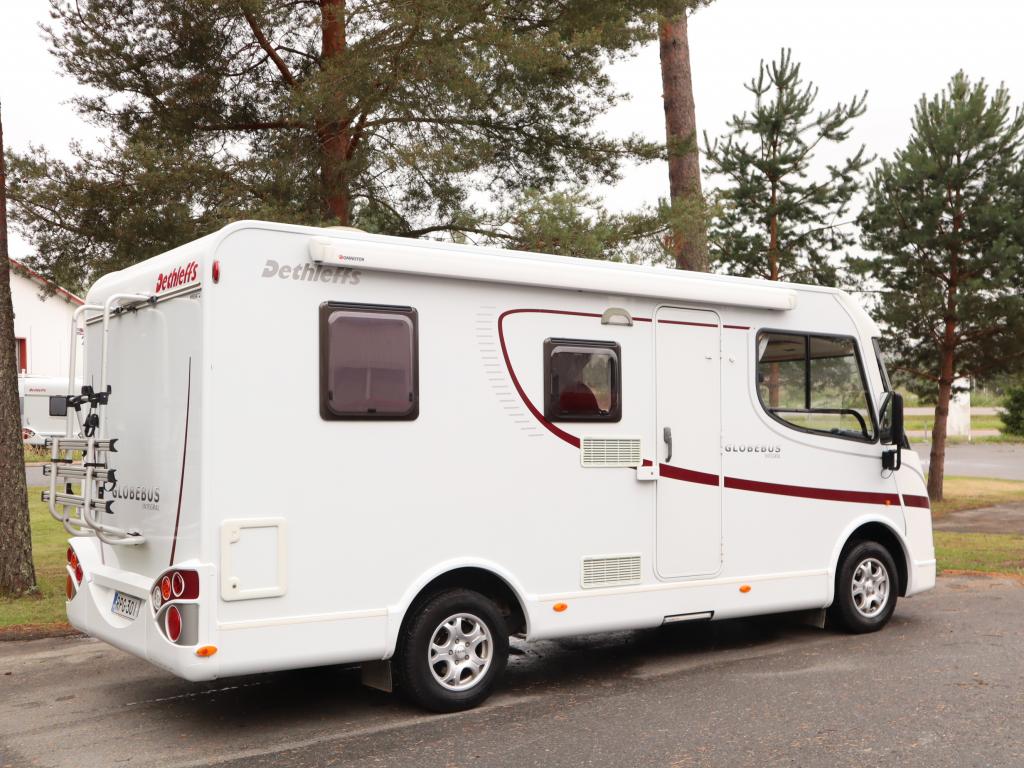 Huippunäppärä, vain 6 m pitkä täysintegroitu Dethleffs jossa istuma- ja makuupaikat neljälle.