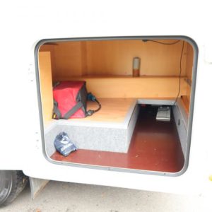 Auton takaosassa pitkittäinen parivuode ja pesuhuone/ WC, edessä valoisa pöytäryhmä ja katosta laskeutuva nostovuode.