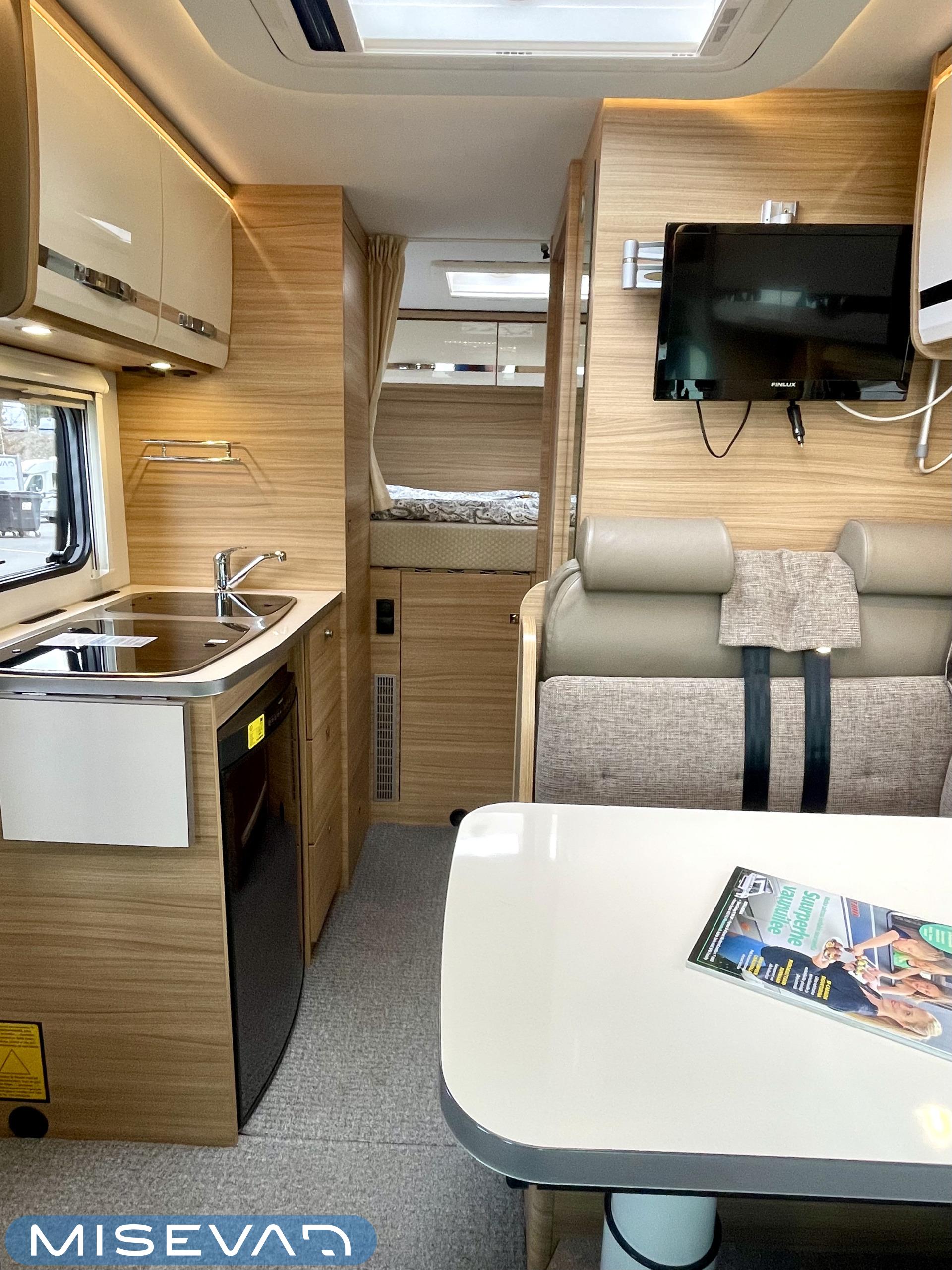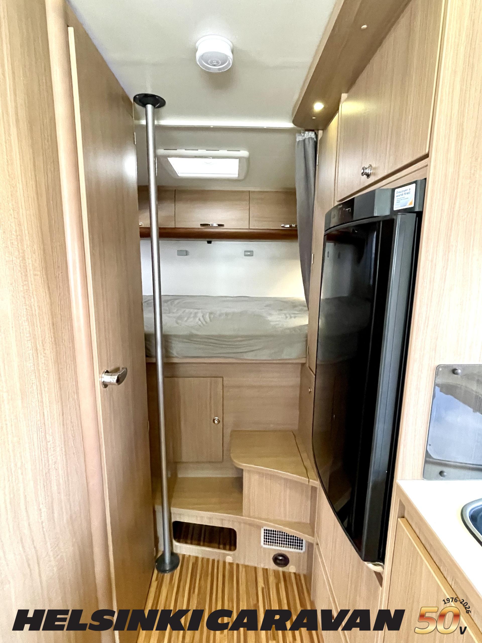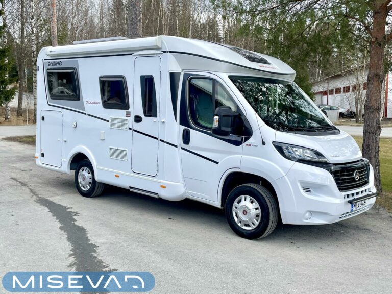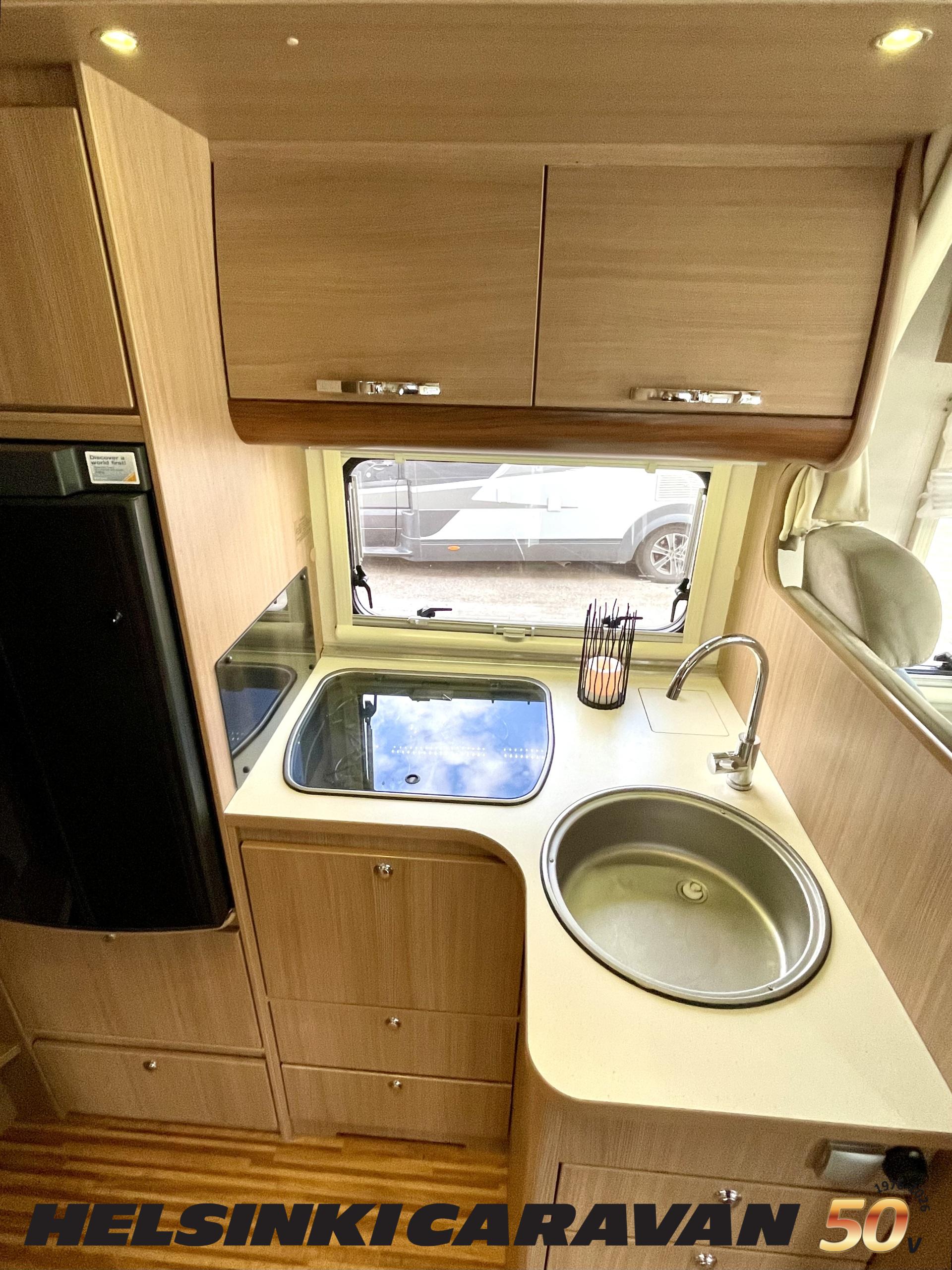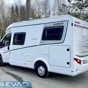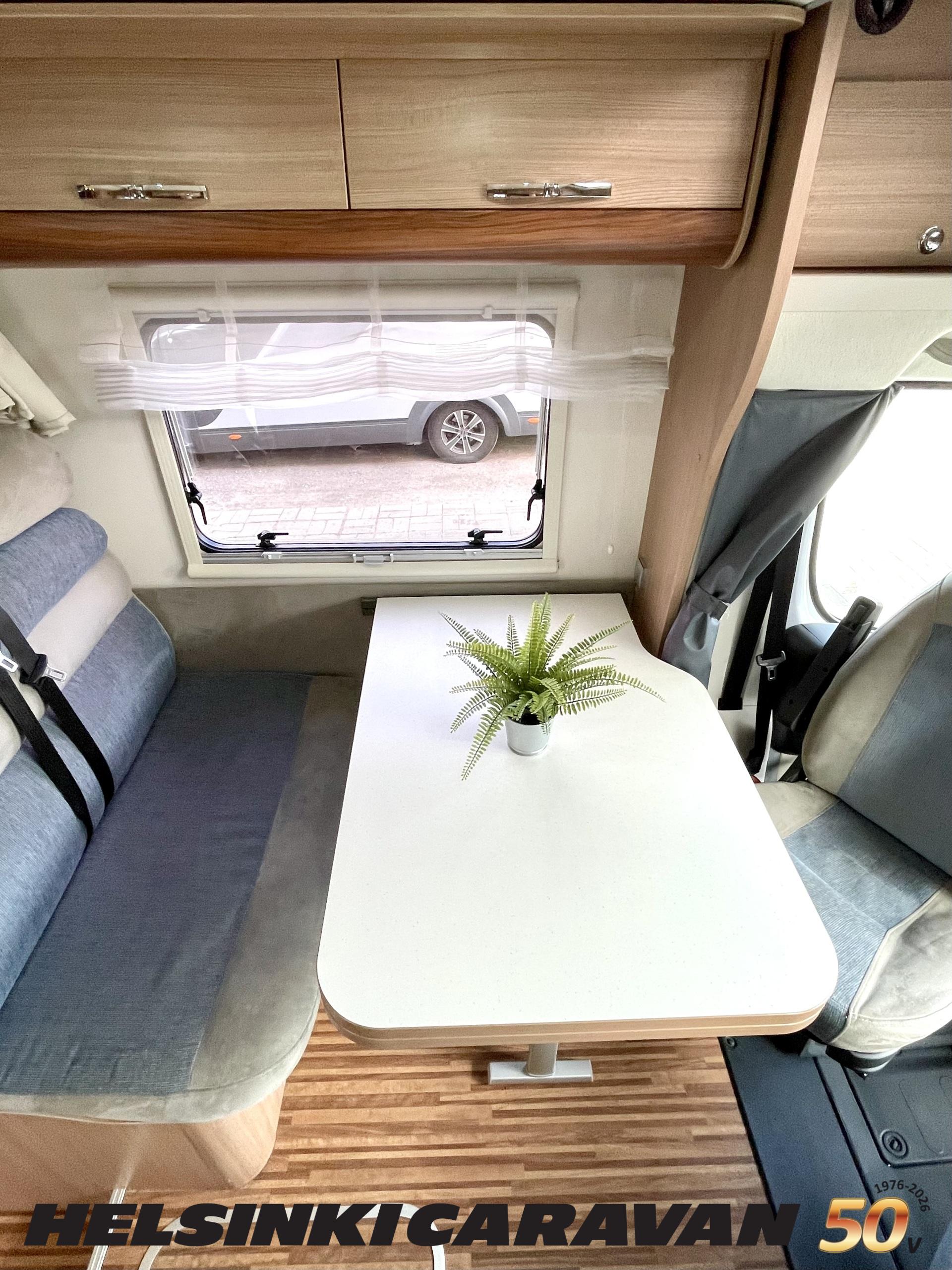 Kyllä silmä lepää tämän Dethleffsin sisustuksessa. Valoa ja vaaleutta riittää ja varsinkin aurinkoisena päivänä voi vain hämmästellä miten nätti auto oikeasti on! Takana on kivan kokoinen parisänky poikittain ja sängyn alla on yksi tämän kompaktin matkakulkineen hienous. Nimittäin iso takatallli. Tämän kokoisessa autossa se ei ole mikään itsestäänselvyys, mutta tässä on ajateltu kaikkia harrastajia ja ulkona viihtyjiä. Peräänhän saisi vaikka kanootinkin mukaan. Ehkä puhallettavan sellaisen kuitenkin. Keittiössä kokkailee helposti niin aamupalat, lounaat ja iltapalatkin. Tilaa on ja kaappeja riittää! Ja vieressä olevan ruokailutilan voi muuttaa myös sängyksi teleskooppijalan ansiosta. Visuaalista lämpöä sisälle tuo myös tyylikkäät puunsävyt ja ripauksen krumeluuria, kromityyliset yksityiskohdat. Ja tämä autohan on juuri hieman alle kuusimetrinen, eikä sitä sisustasta kyllä huomaa mitenkään. Auton pituus tai tässä tapauksessa lyhyys, tekee myös sen että sillä mahtuu helpommin parkkiin kuin parkkiin. Upea ja tyylikäs kokonaisuus! Tule tutustumaan paikanpäälle ja aurinkoisena päivänä kannattaa ottaaaurinkolasit mukaan. Tulet vielä häikäistymään!
