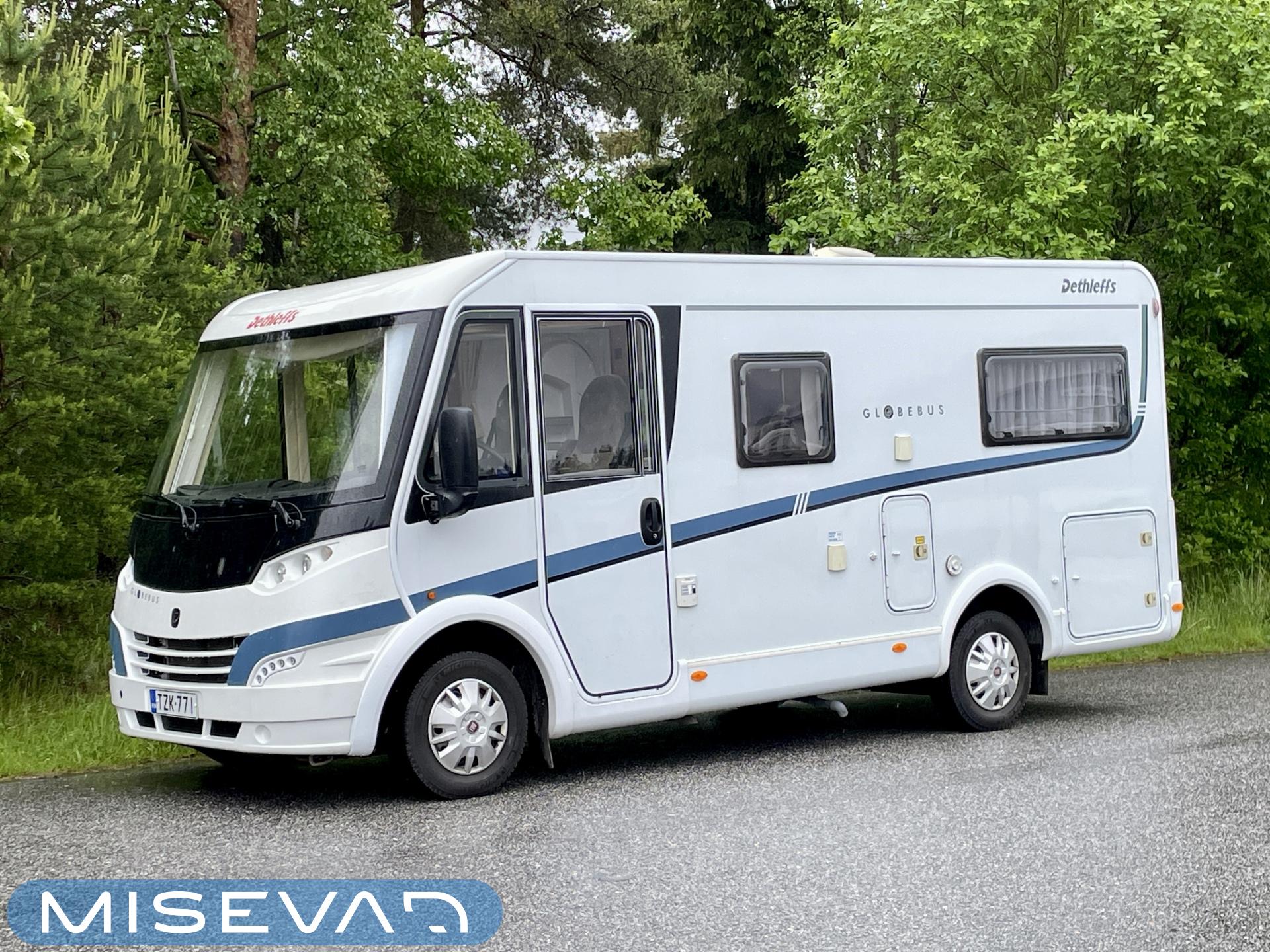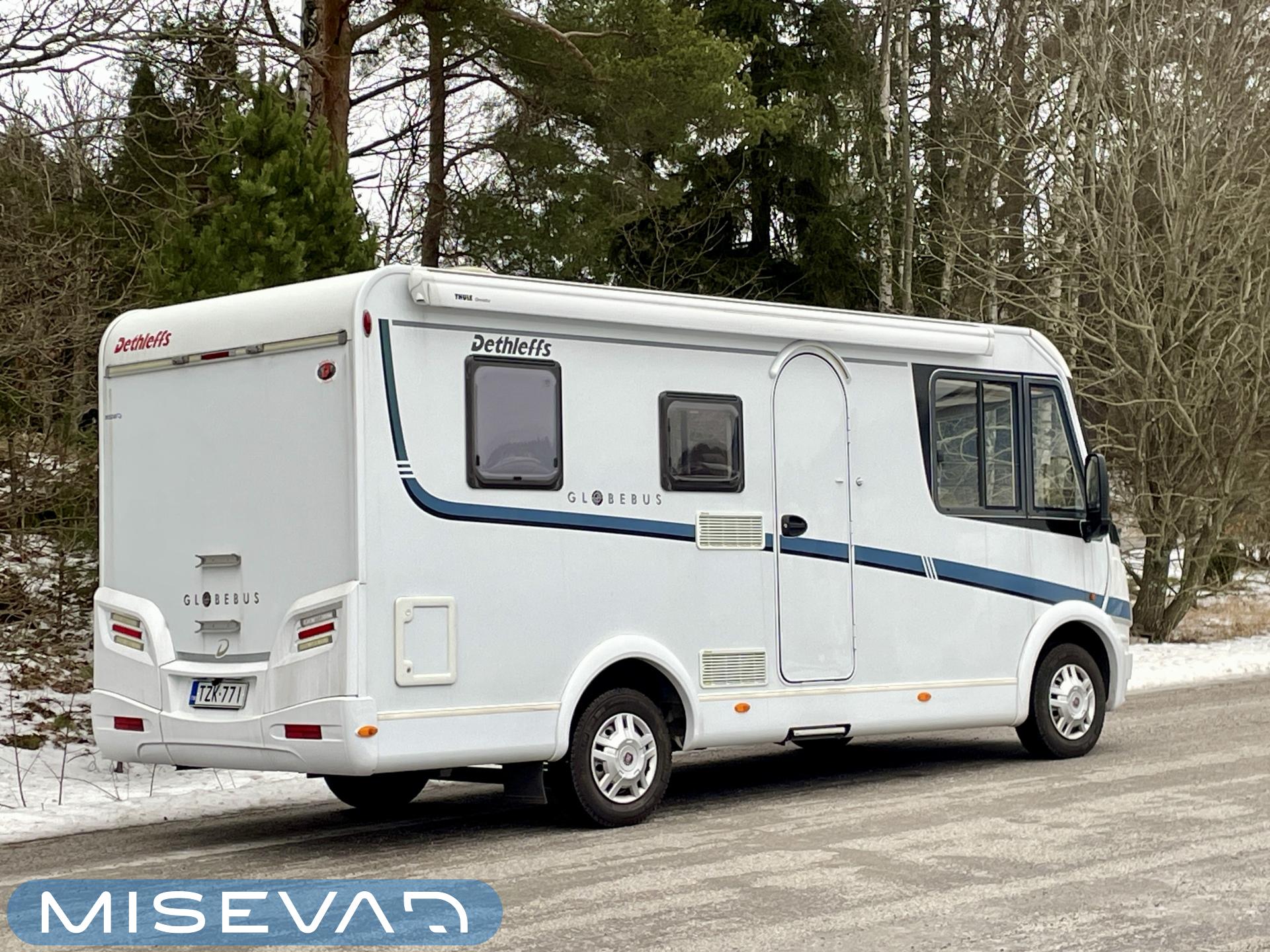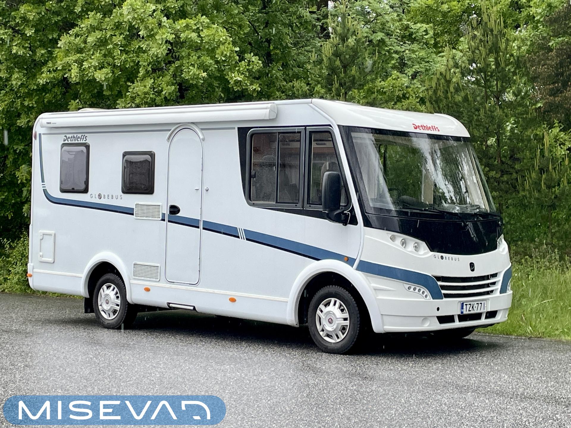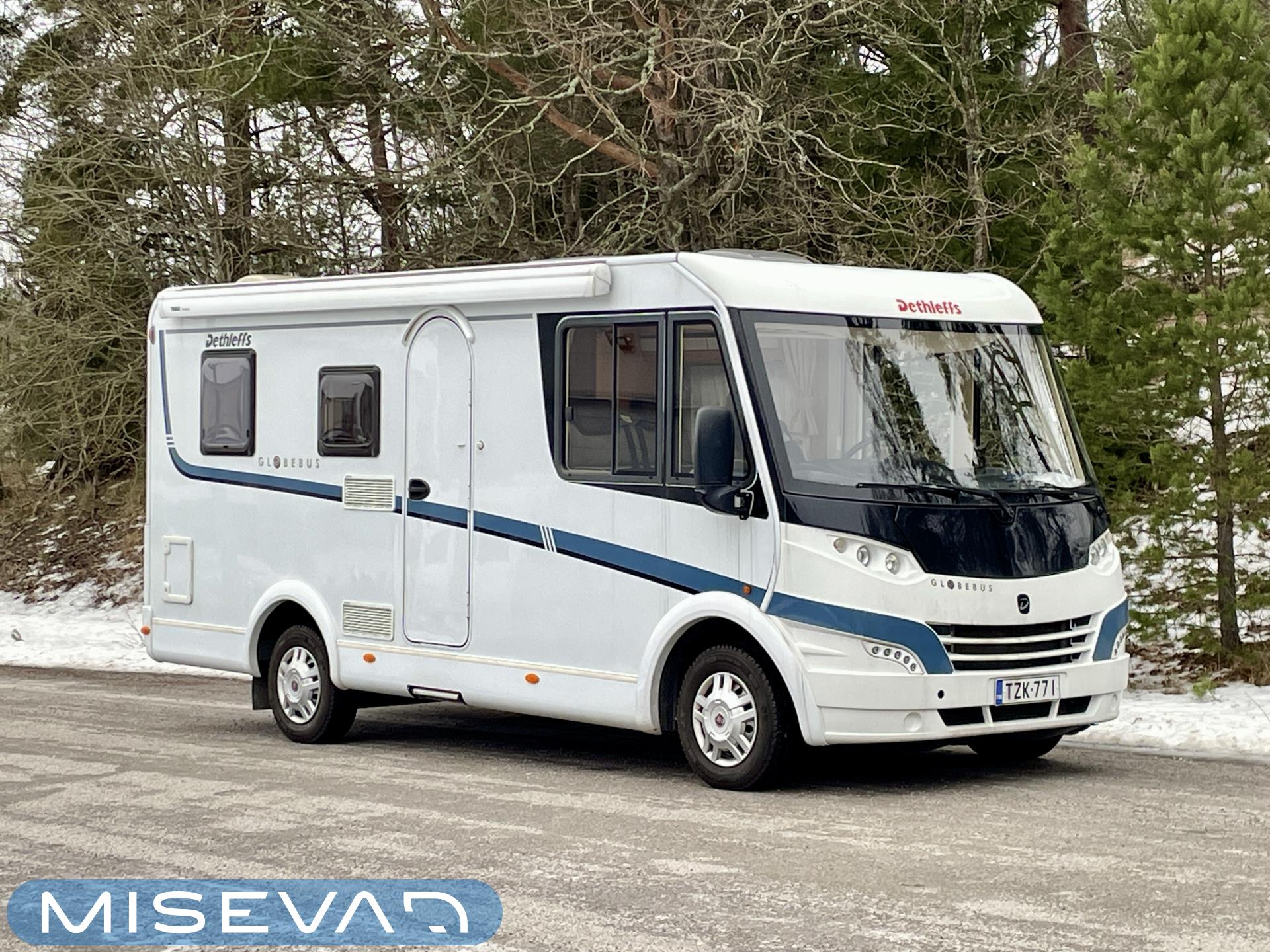 Tosi hieno lyhyt integroitu Dethleffs Globebus joka on kapeampi ja siten melkein retkeilyauton kokoinen.