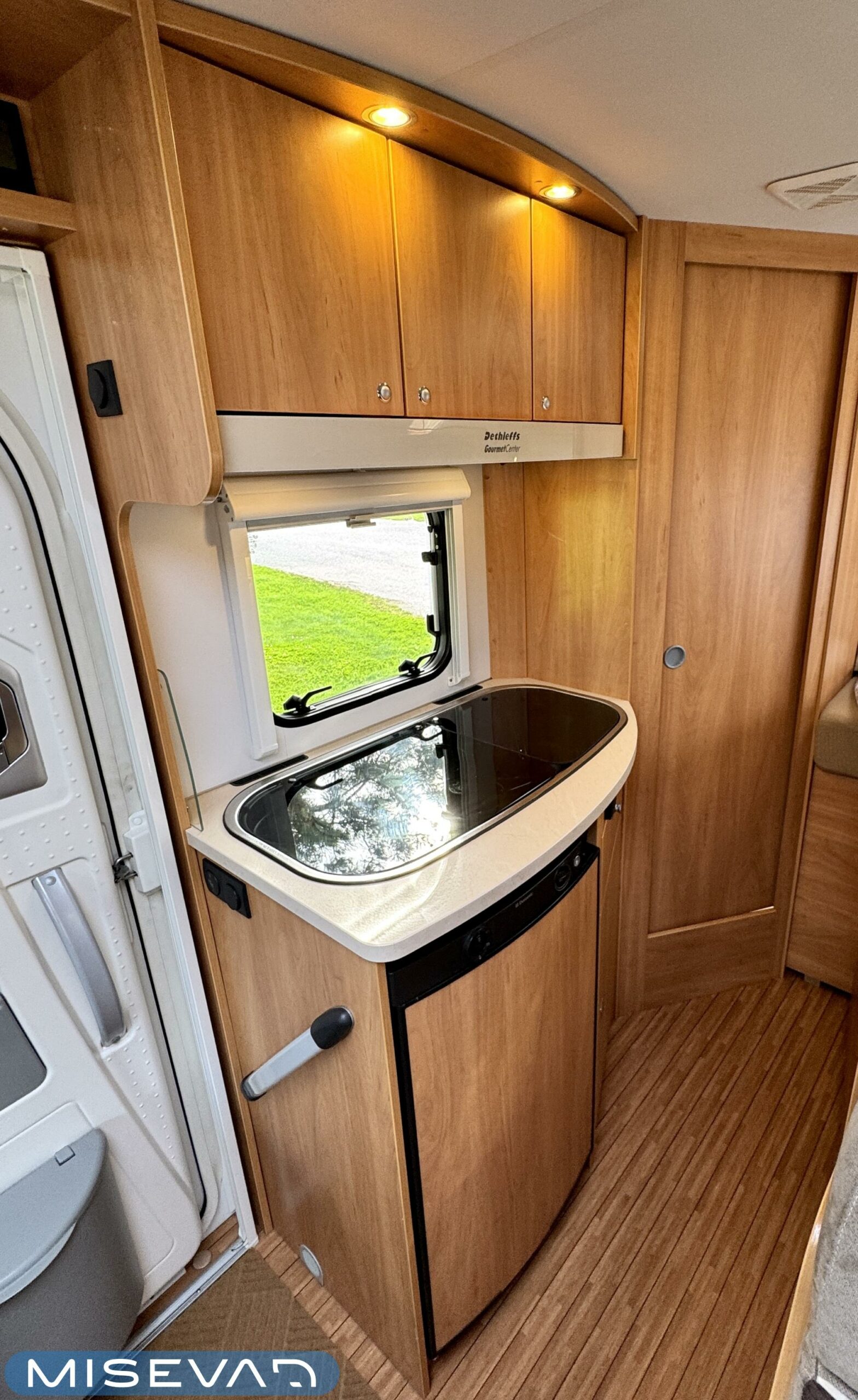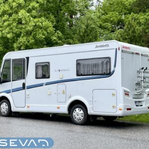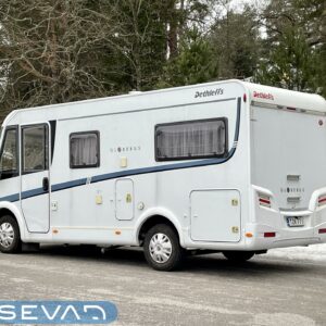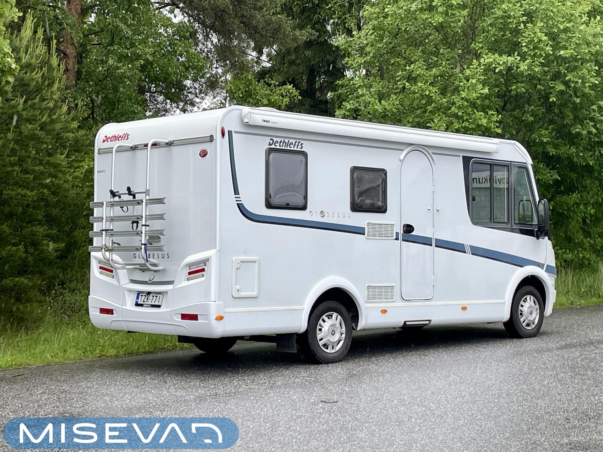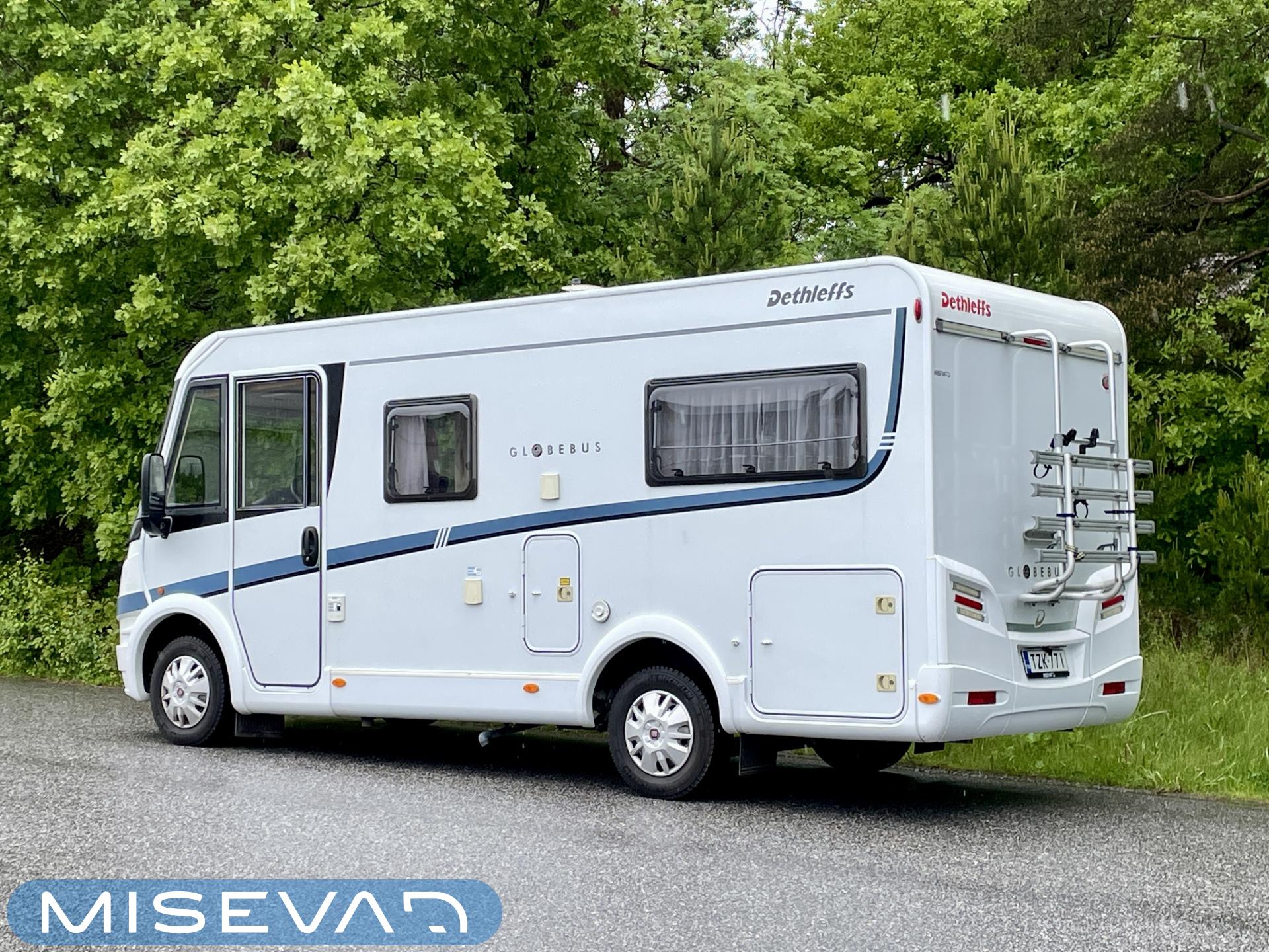 Tosi hieno lyhyt integroitu Dethleffs Globebus joka on kapeampi ja siten melkein retkeilyauton kokoinen.