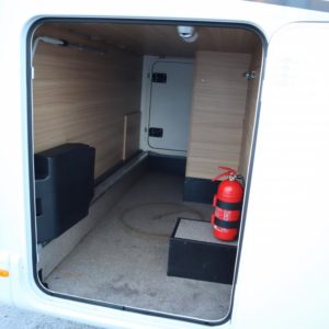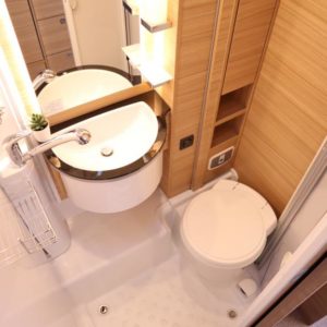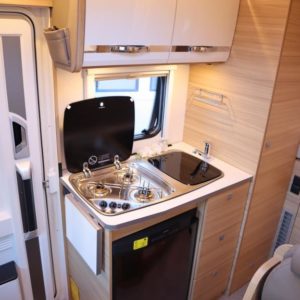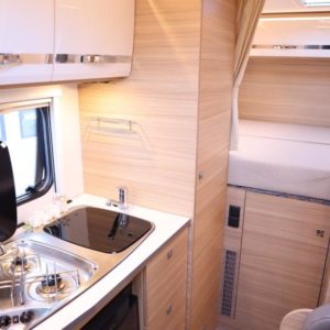 Pieni ja näppärä puoli-integroitu Dethleffs Globebus T1. Takana parivuode poikittain. Vuoteen alla suuri tavaratila ja auton molemmilla puolila luukut tavaratilaan. Keskellä keittiö, korkea vaatekaappi ja näitä vastapäätä wc/suihku. Edessä pöytäryhmä kääntyvin ohjaamon istuimin.