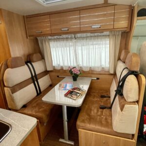 Etuosan istuinryhmään tuo valoa iso kattoluukku. Pöytäryhmä on sijattavissa toiseksi parivuoteeksi.