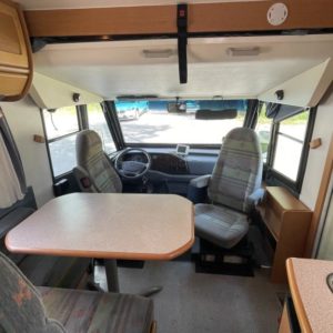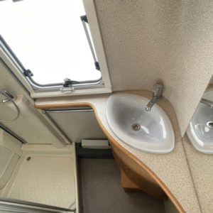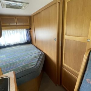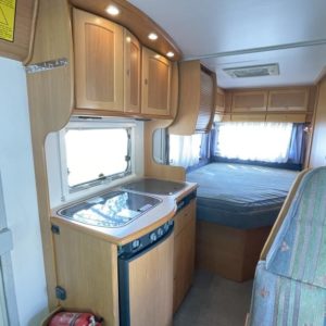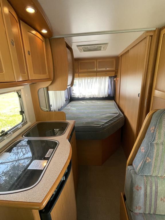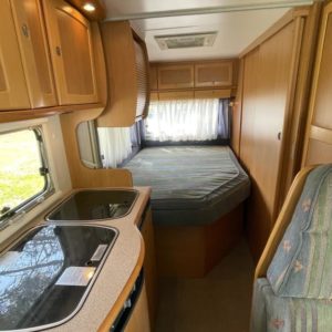 Pohjaratkaisussa edessä sohvaryhmä sekä laskuvuode. Keskiosassa keittiö ja kaappitilaa. Takaosassa pitkittäinen parivuode ja Wc & Suihkutila.