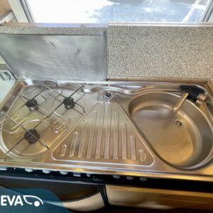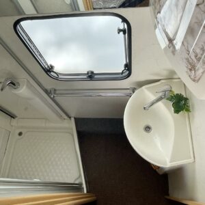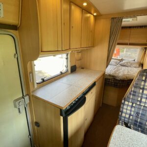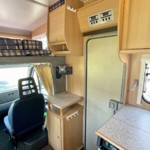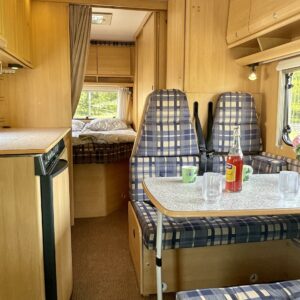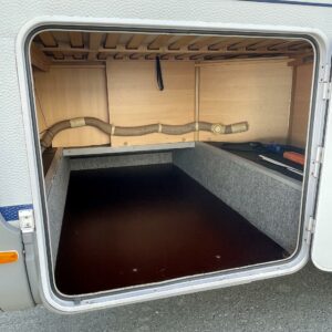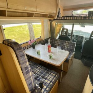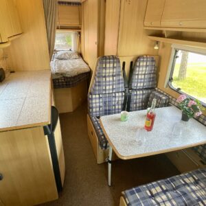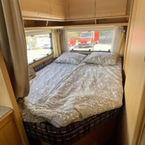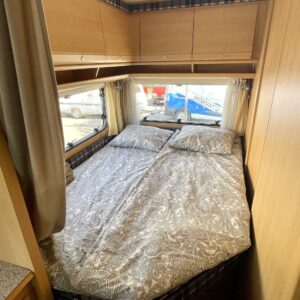 Toimiva pohjaratkaisu; auton takaosasta löytyy pitkittäinen parivuode ja tilava pesuhuone/ WC erillisellä suihkunurkkauksella. Vuoteen alle mahtuu mukavan kokoinen tavaratila. Auton etuosasta löytyy leveä alkovivuode ja vastakkainistuttava pöytäryhmä.