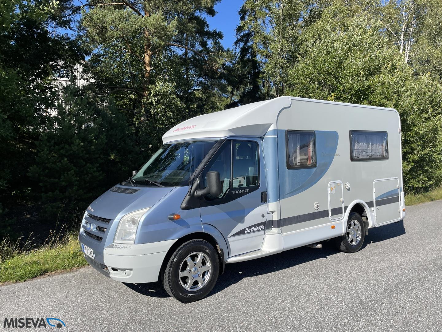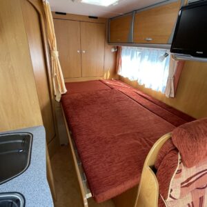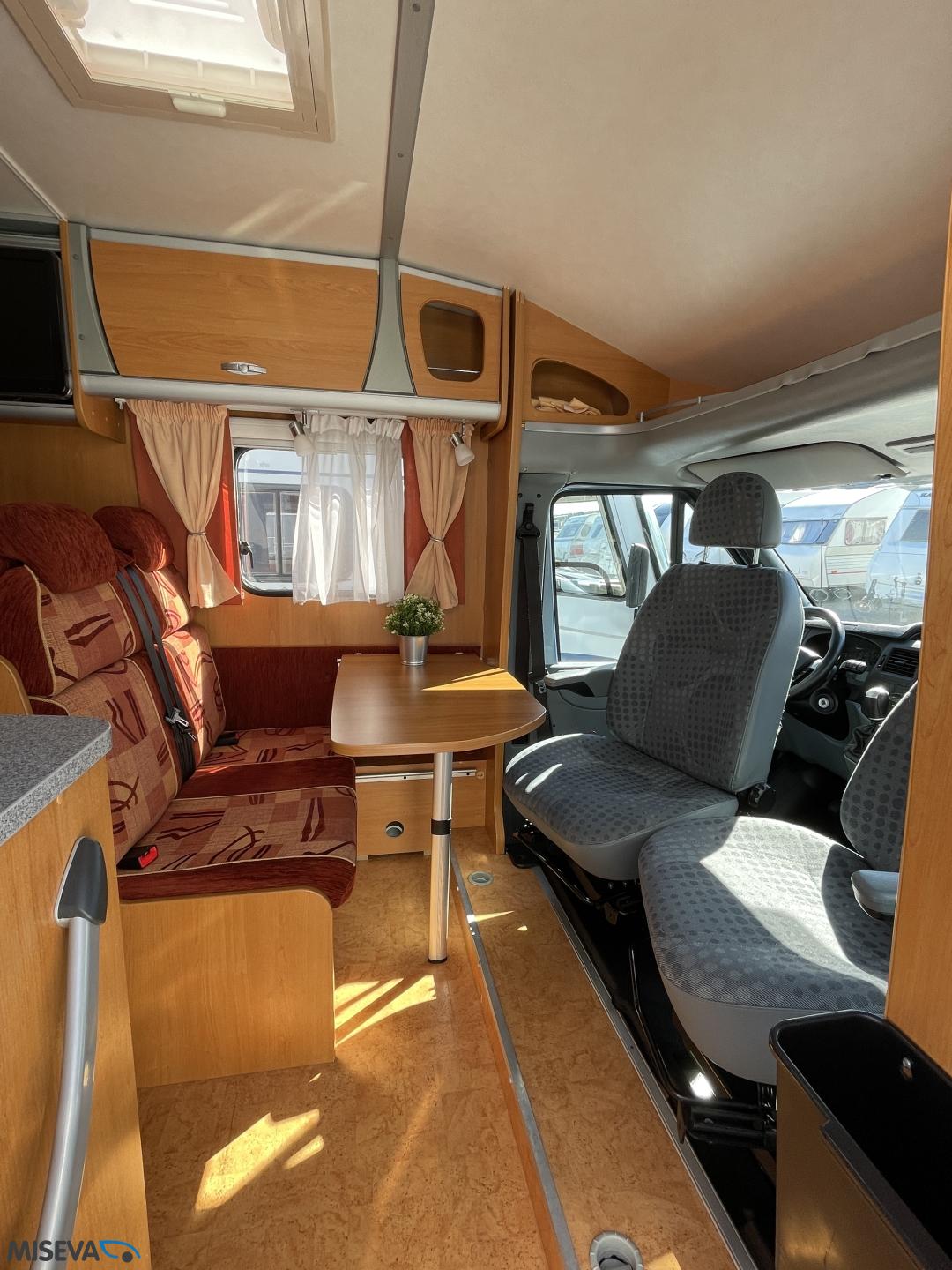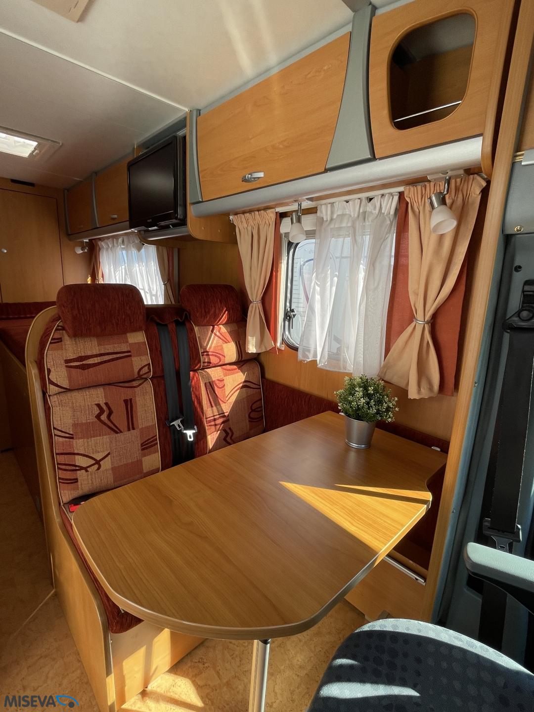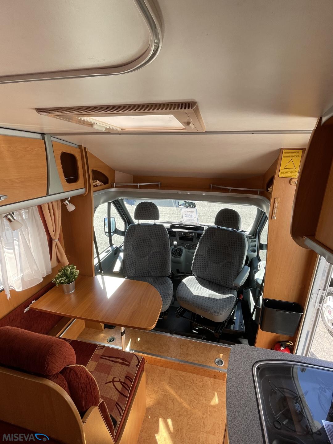 Takana levitettävä parivuode sekä wc-tila suihkulla. Keskellä keittiö. Edessä pöytäryhmä neljälle kääntyvin ohjaamoistuimin.