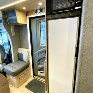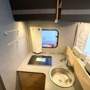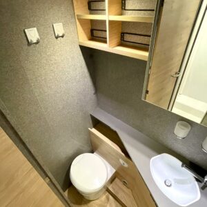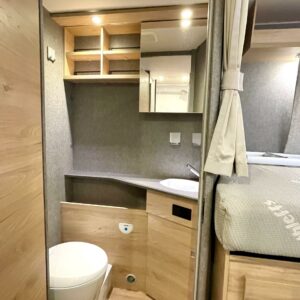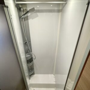 Suuri erillinen suihkutila sijaitsee auton keskitilassa vastapäätä avaraa suihkuhuonetta. Wc:n ovi toimii samalla osastoivana väliseinänä eristäen taka- ja keskitilat tarvittaessa toisistaan vaikka päivänokosten ajaksi.