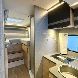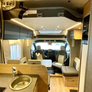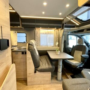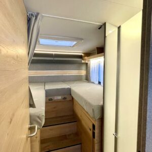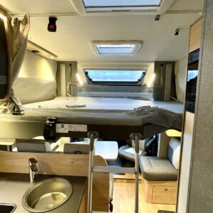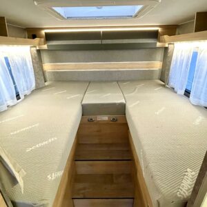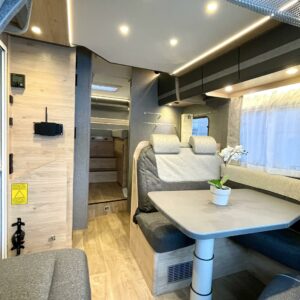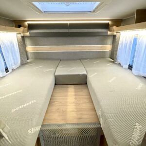 Pitkittäisillä erillisvuoteilla ja sähköisellä nostovuoteella varustettu pohjaratkaisu toimii loistavasti niin kahdenkeskisillä reissuilla kuin koko perheen yhteisillä elämysmatkoilla. Trumaticin tehokas ilmakeskuslämmitys toimii sekä kaasulla- että sähköllä ja kyytiin mahtuu koko reissun matkatavaroiden lisäksi kolme polkupyörää hissitoimiseen ulkoiseen telineeseen. Pitkä kotelomarkiisi suojaa niin porotukselta kuin yllättäviltä sadekuuroilta.