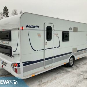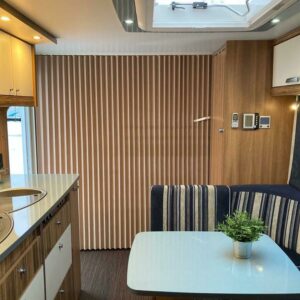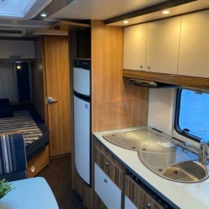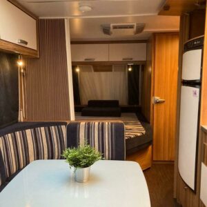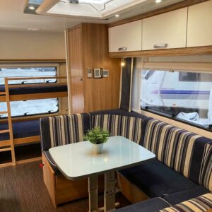 Näppärän kokoinen perhevaunu. Takana kerrosvuoteet pitkittäin , keskellä keittiö ja U-istuinryhmä johon mahdollista pedata lisävuode, edessä parivuode pitkittäin ja kylpyhuone/WC. Nukkumapaikat jopa 6:lle